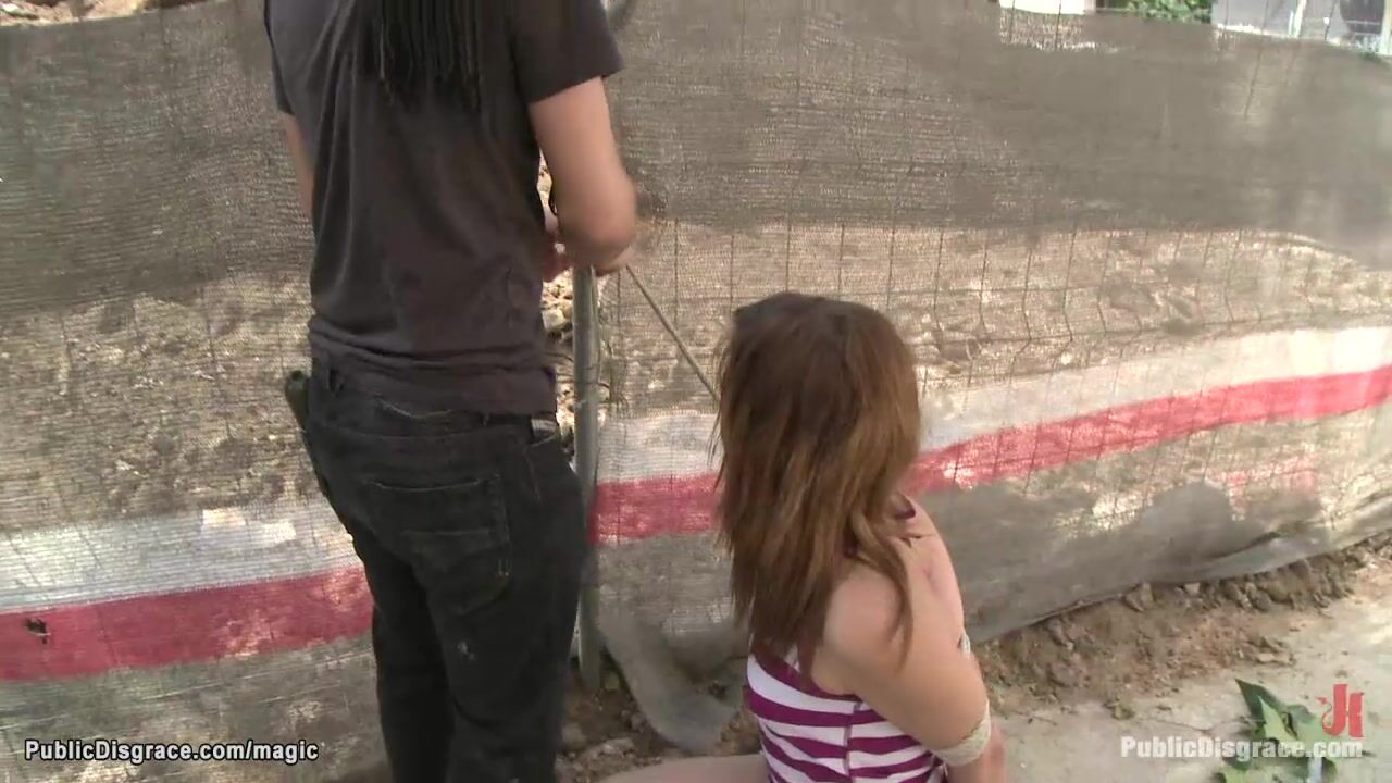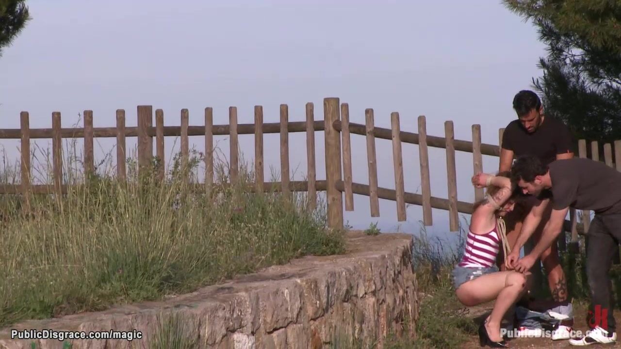 Naked bound European teen slave Dulce Mariposa in public interupted by police then dragged in park gang bang fucked by big cock James Deen and stranger and face cummed