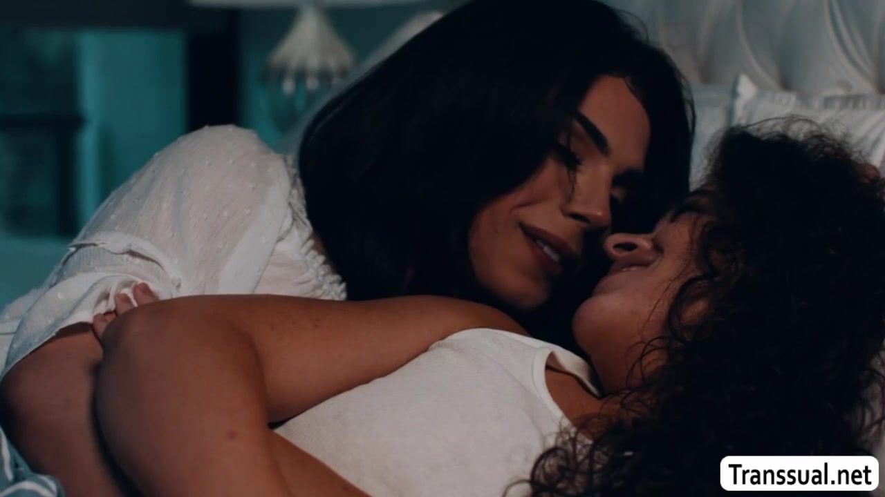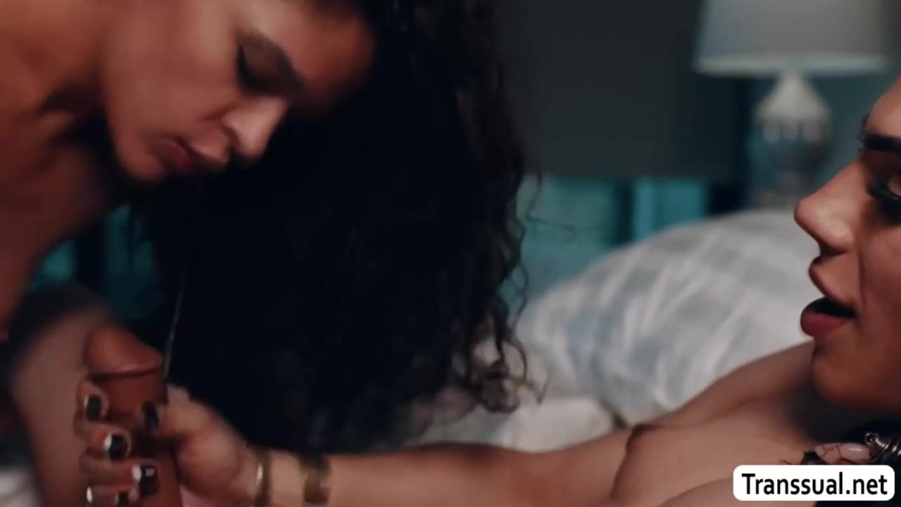 Trans stepmom and her curly haired stepdaughter are on the bed kissing each other.Next is,she lets her stepdaughter throat her hard shecock and in return,she licks her tight pussy first and she then fucks it so deep and hard.
