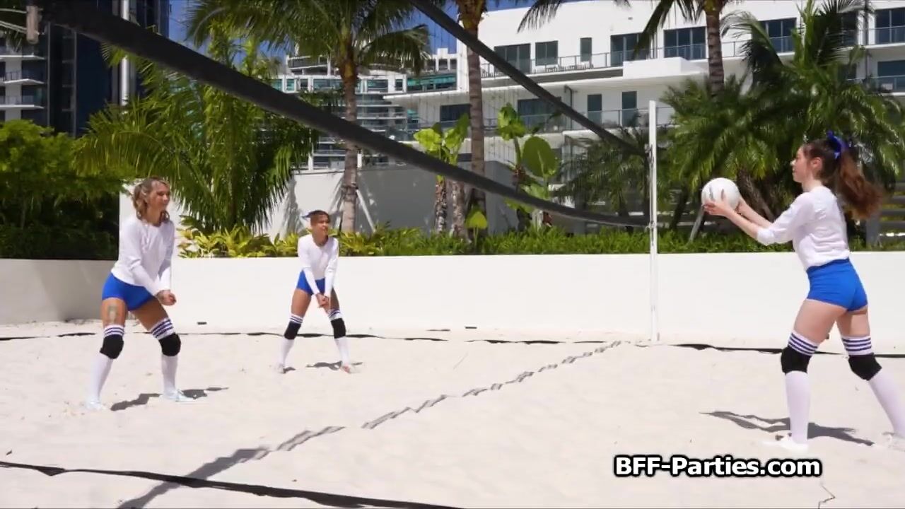 The trainer was chillin in his room when the three volleyball chicks started to play with each other.. he had no problem to join the oral fun!