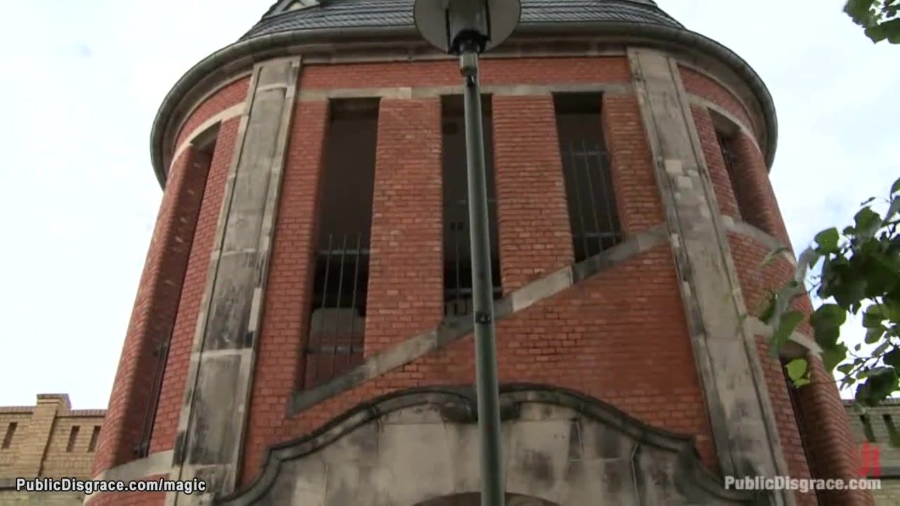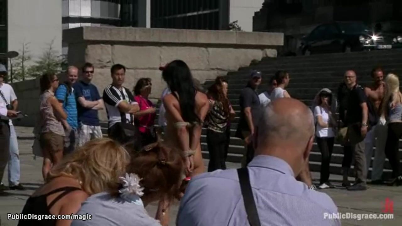 Naked brunette Euro babe Felicia D gets hands bound behind back and mouth gagged made to walk in public then pussy fingered and mouth fucked by big cock master Tommy Pistol