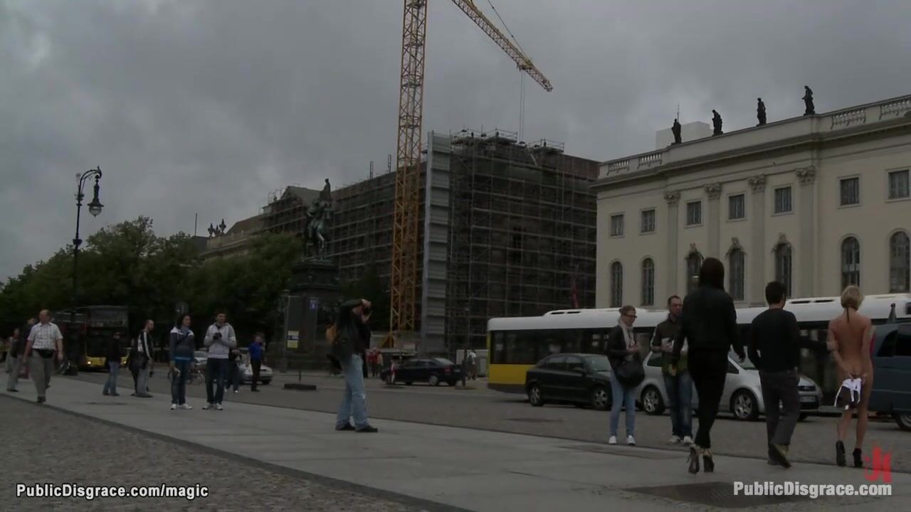 Handcuffed and gagged naked Euro blonde Diana Pink is walked in public then blindfolded gang bang fucked by big cocks in underpass
