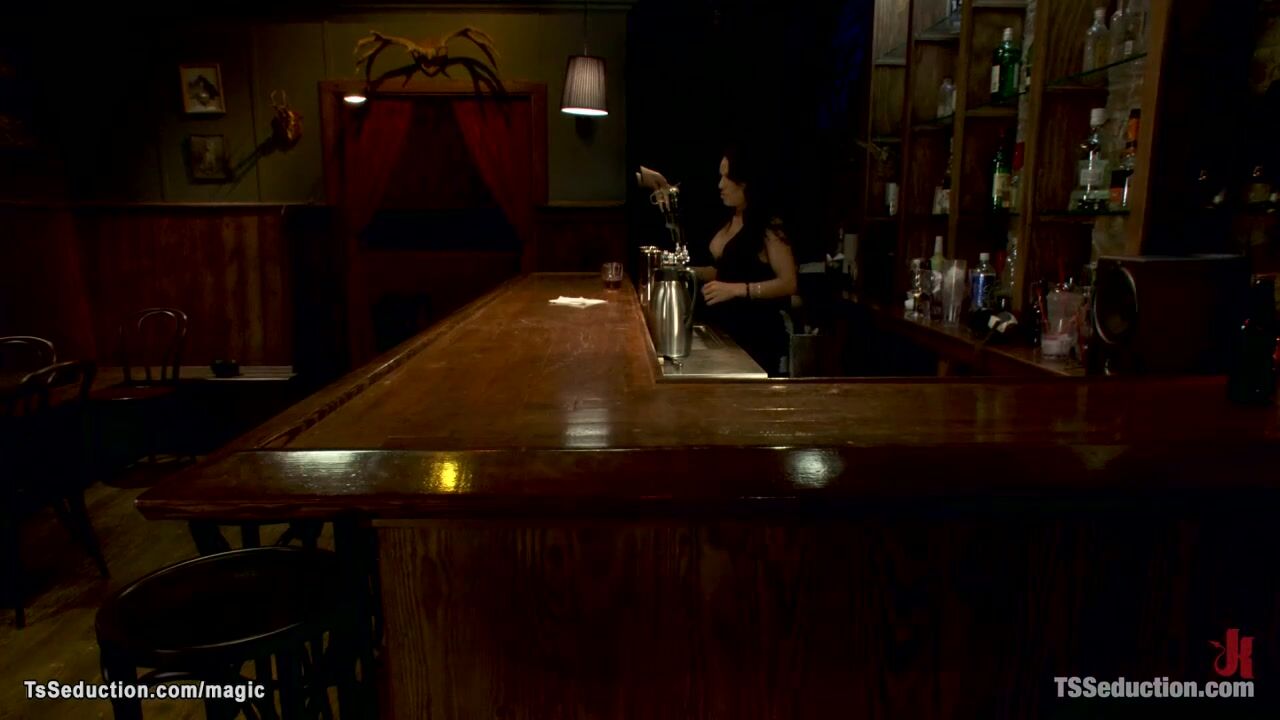Big tits brunette shemale bartender Ts Foxxy seduces client Chris Archer in her bar and with big cock fucks him in mouth and ass on table