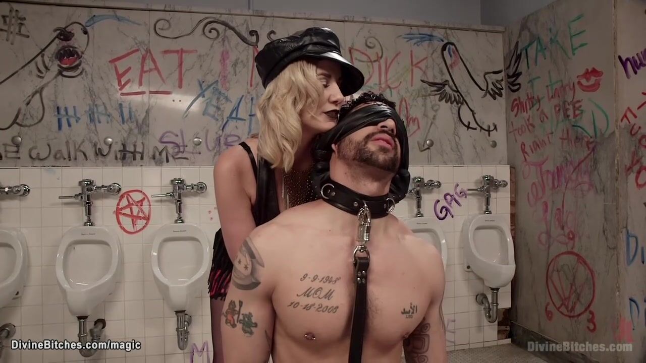Blonde femdom Maitresse Madeline Marlowe hard whips tattooed men on knees Samir Hott then binds him in straitjacket and pegs in public toilet till rides dildo gag above his face