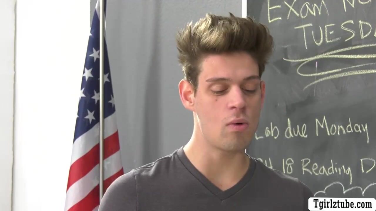 Latina TS teacher caught her student destroying her table.Instead of getting mad,she lets him pull out his dick and she then throats his big cock passionately.In return,her student licks and barebacks her wet ass so deep and hard.