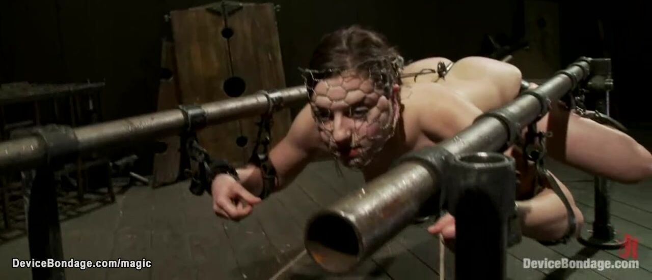 Bound in standing position brunette slave Missy Minks gets whipped then strapped between parallel bars in frog position gets anal hooked and caned by master Orlando