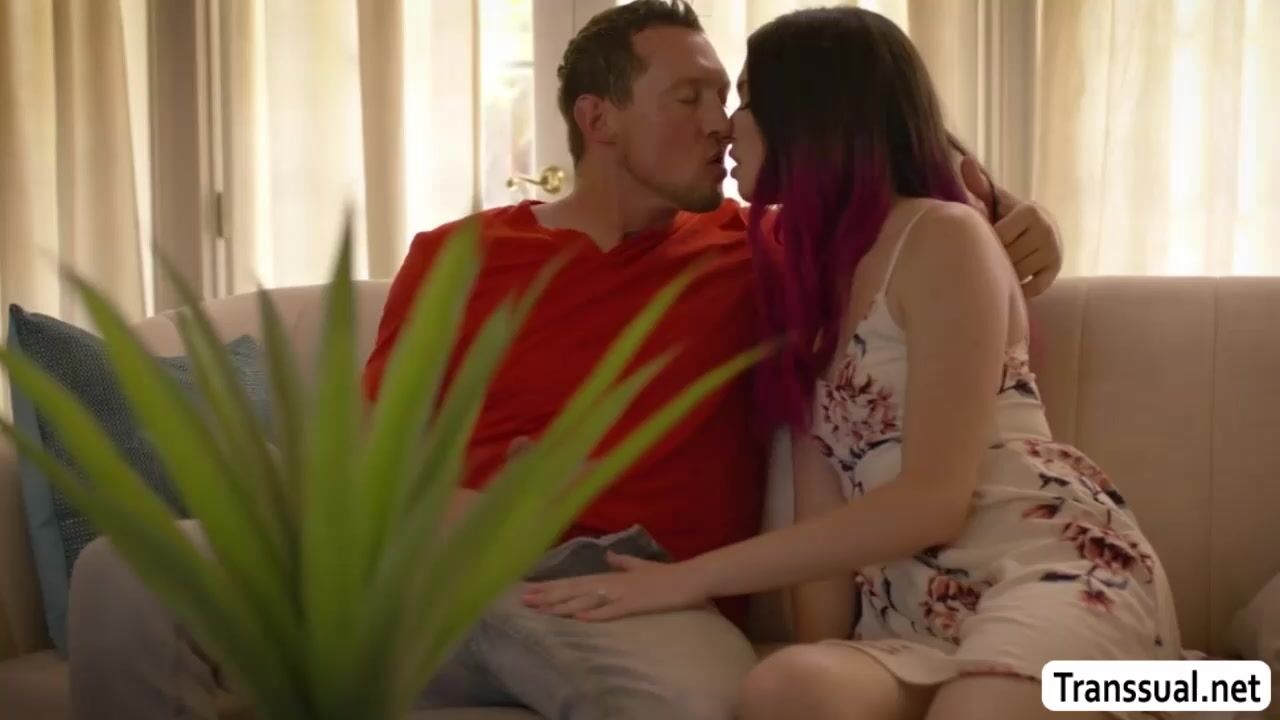 Stepbro visits his TS stepsister in their old house.After that,they start kissing each other on the couch passionately.Next is,she throats the big cock of her stepbrother and in return,he licks her ass first and then barebacks it so hard.
