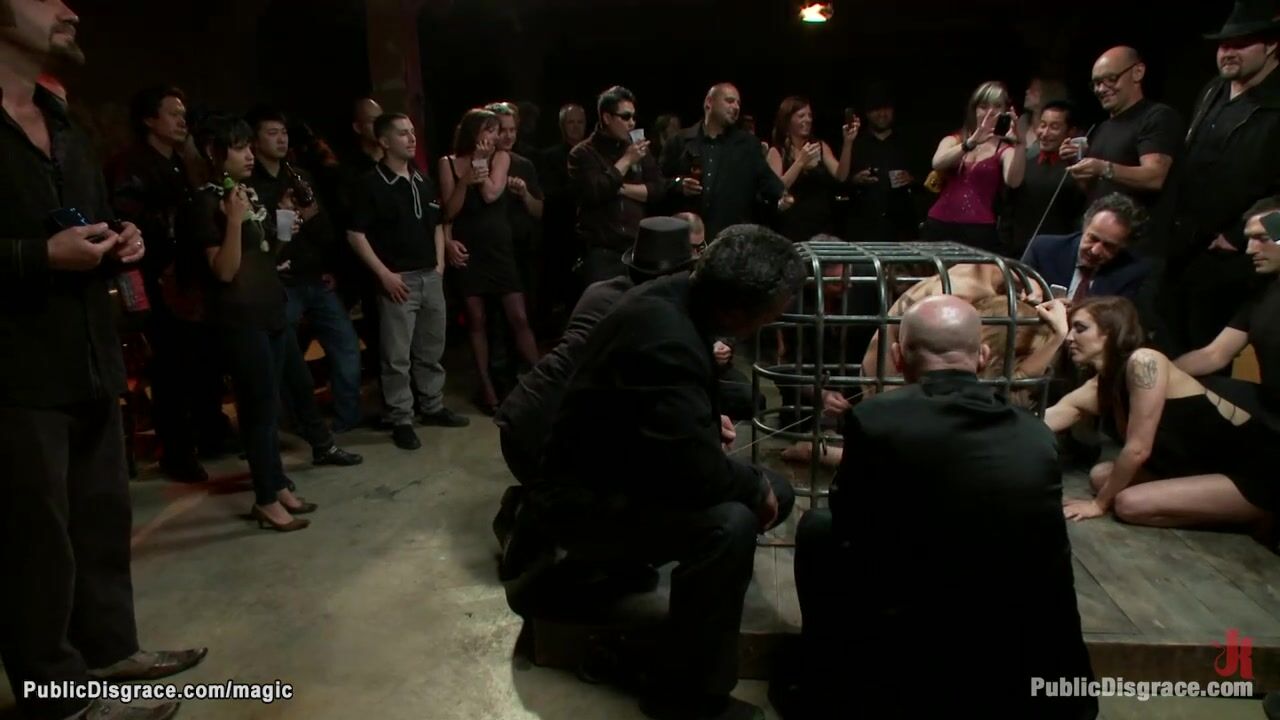 Description: Locked in small cage busty blonde slave Audrey Rose gets skin clamped and pulled by strangers then rough whipped out of cage and gang bang fucked in public