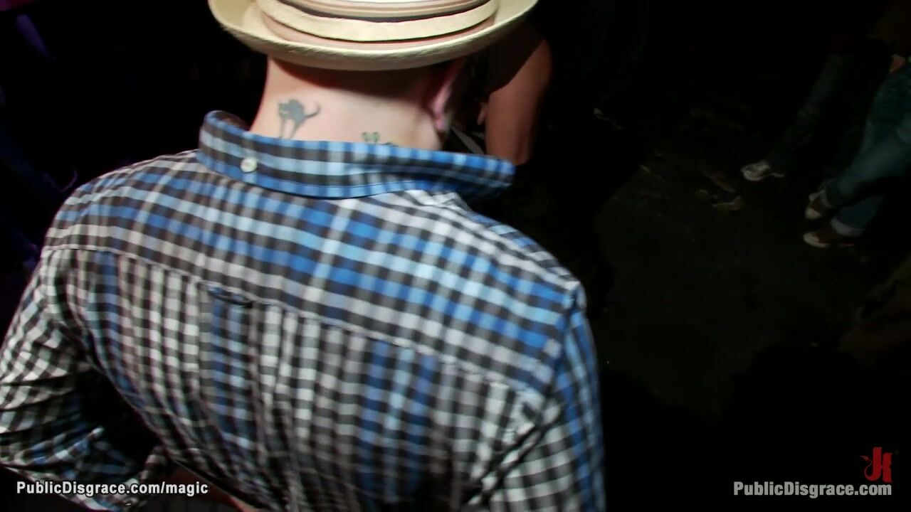 Bound big tits blonde Cherry Torn gets spanked and throat fucked then gang bang fucked by strap on and huge cock of Mark Davis in public crowded bar