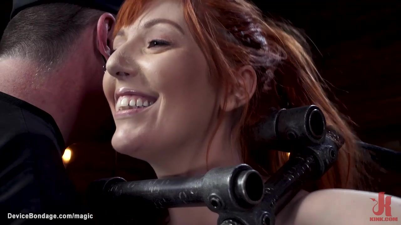 Natural huge boobs ginger MILF slave Lauren Phillips bound in standing position with locked beck in metal shackle and hands spread and chained gets caned then pussy fucked with dildo