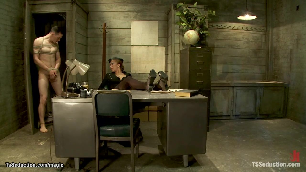 Shemale guard Latina Jessica Host binds employee Martin Lorenzo and sucks his dick then with big cock fucks him in mouth and ass in the office