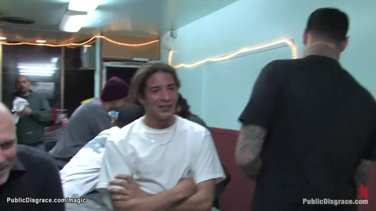 Dirty babe Delilah Knight broungt by Mark Davis and Princess Donna Dolore on a lesh in public restaurant where gets humiliated and fucked by big cocks