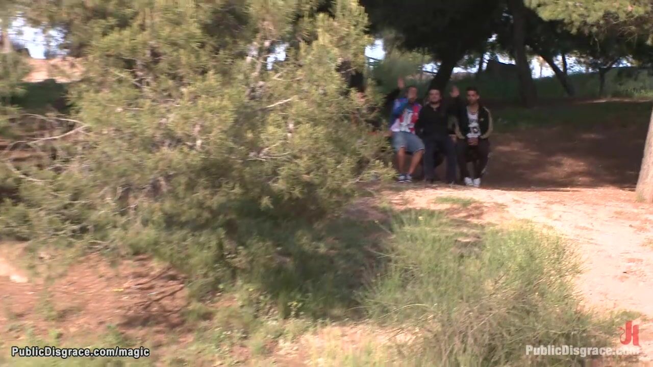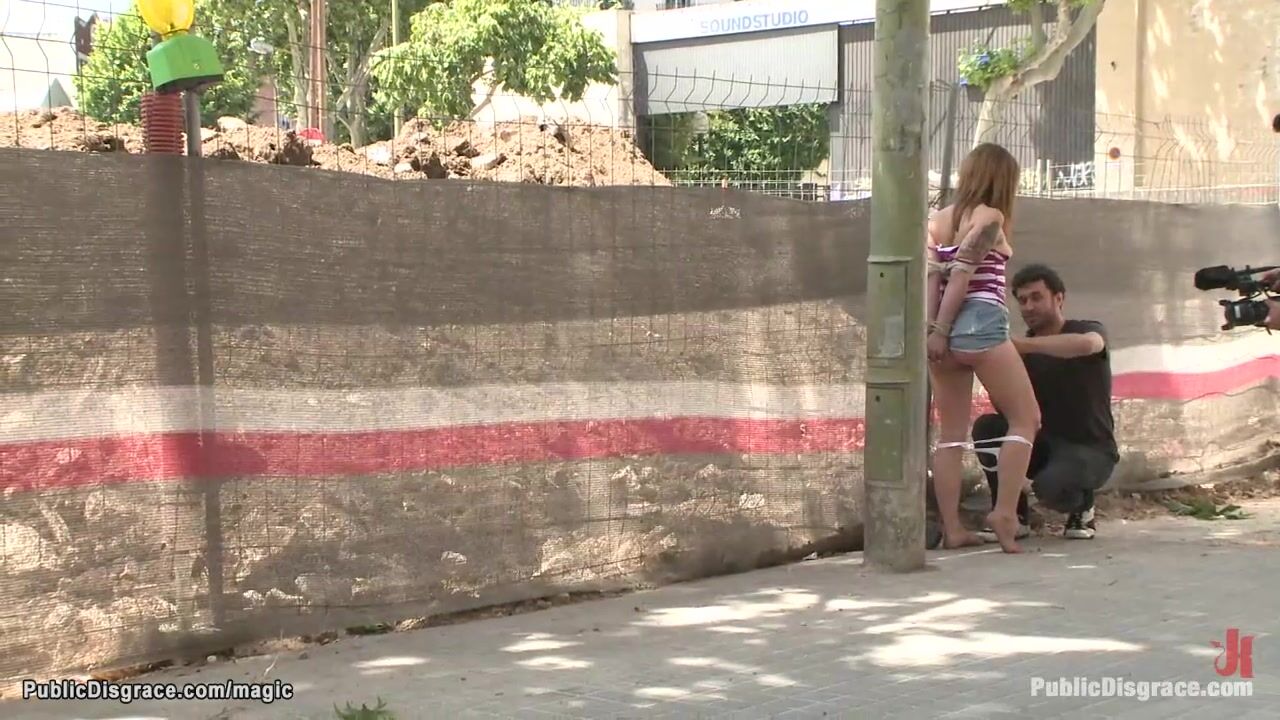 Euro teen Dulce Mariposa bound and mouth fucked in public streets then dragged in park and pussy fucked by big cock master James Deen