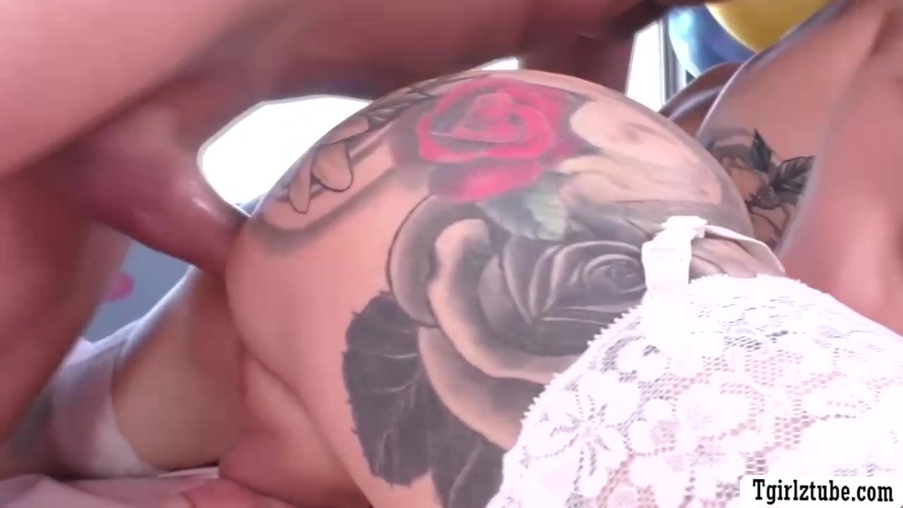 Tattooed shemale Luna Love gets her wet ass bareback fucked