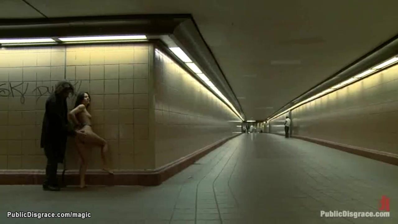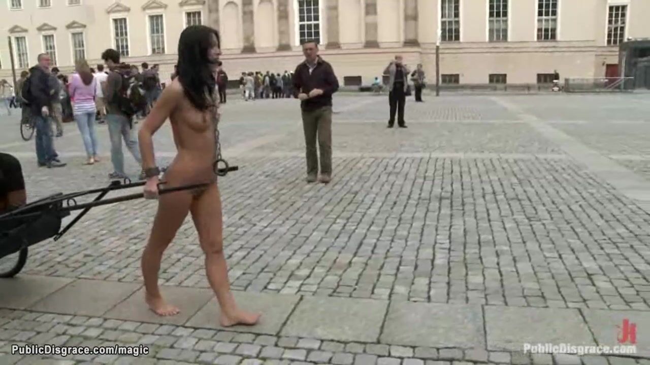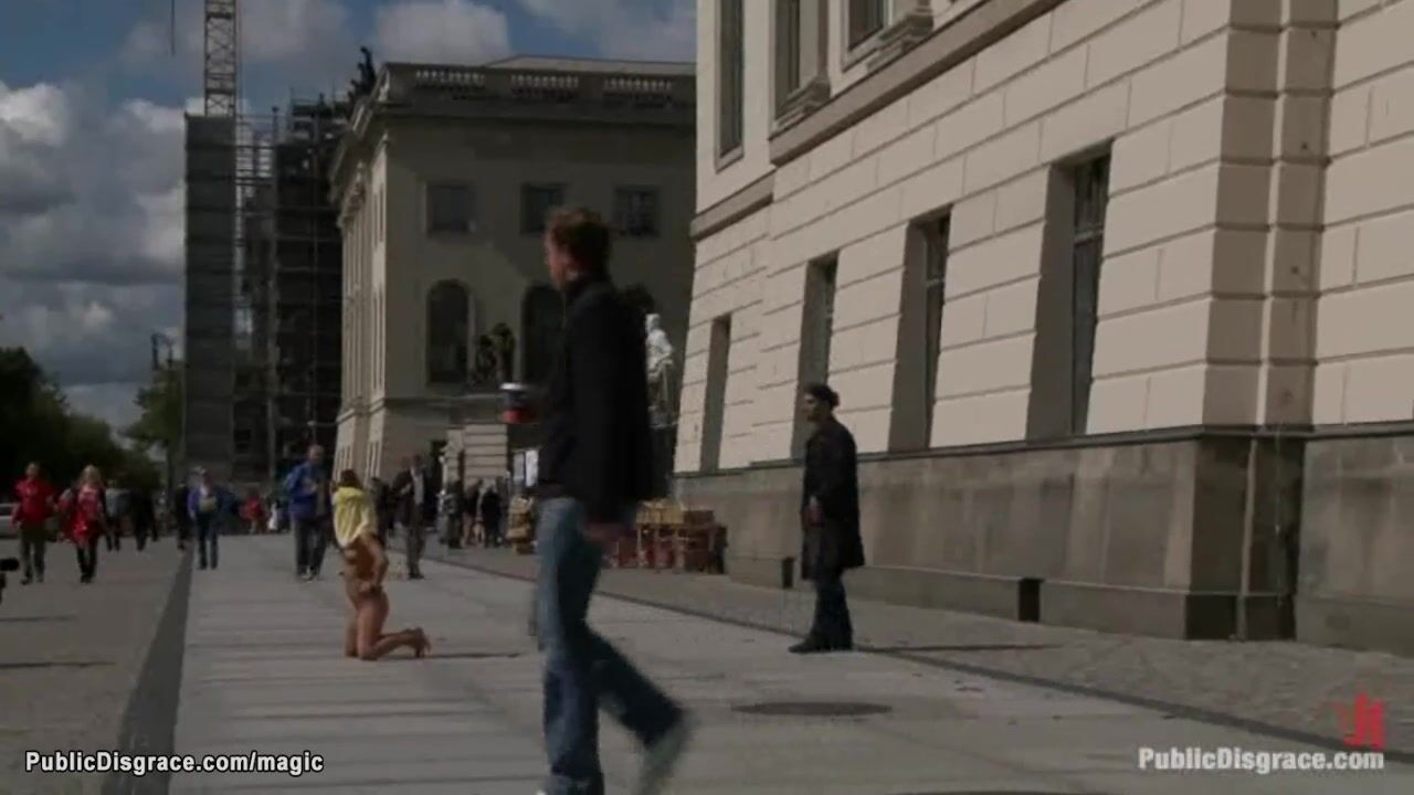 Little Romanian babe Amabella is chained and left down on knees posing in public square then analfucked by big dick Zenza Raggi all over town