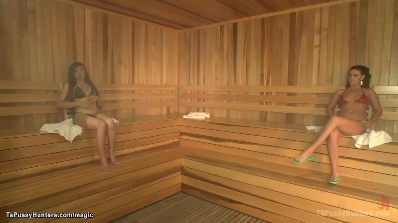 Brunette Asian shemale Venus Lux gets horny in steamy sauna beside sexy brunette Roxy Raye then takes her and anal fucks with big dick in toilet
