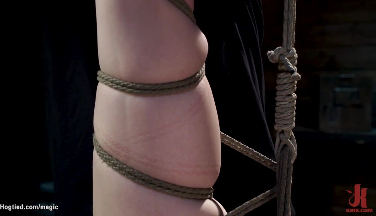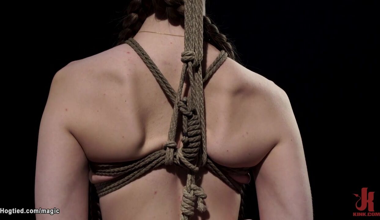 Tall brunette babe Erin Everheart is tight bound in standing position then one leg suspended in the air and shaved pussy vibed by master The Pope on hogtied