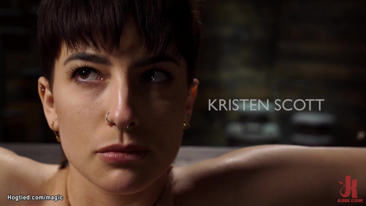 Master The Pope binds sexy brunette slave Kristen Scott to wooden piny in squating position then puts her in back arch position and rough whips