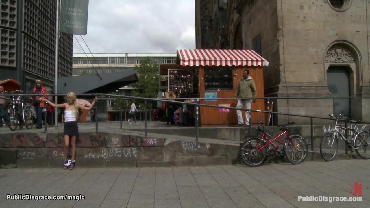Small tits Euro blonde Blanche Summer is handcuffed and panties stripped down on ankles in public for everyone to see then mouth fucked in park by big cock master Zenza Raggi