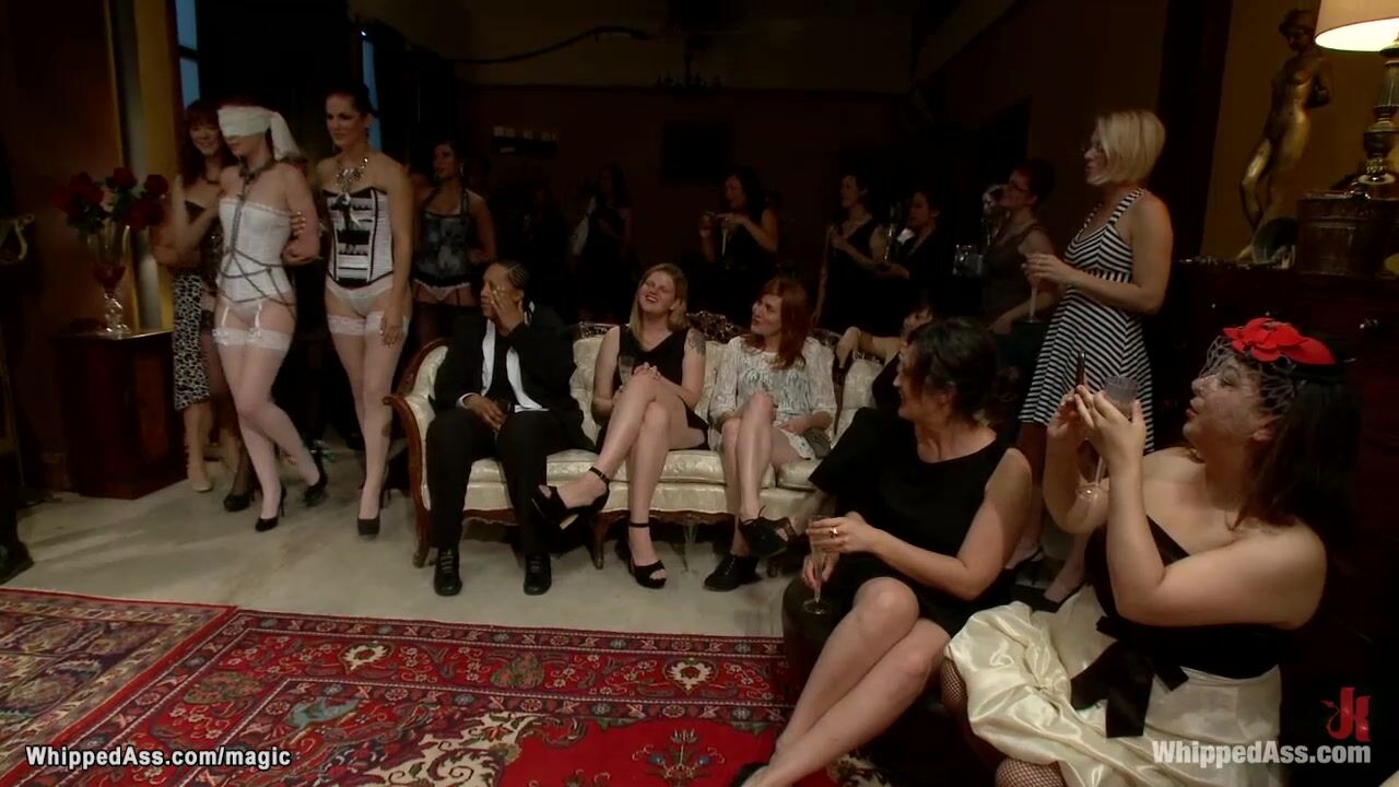 Hot submissive lesbian babe Justine Joli is chained and blindfolded then whipped and fucked in bdsm lezdom group at public Bday party