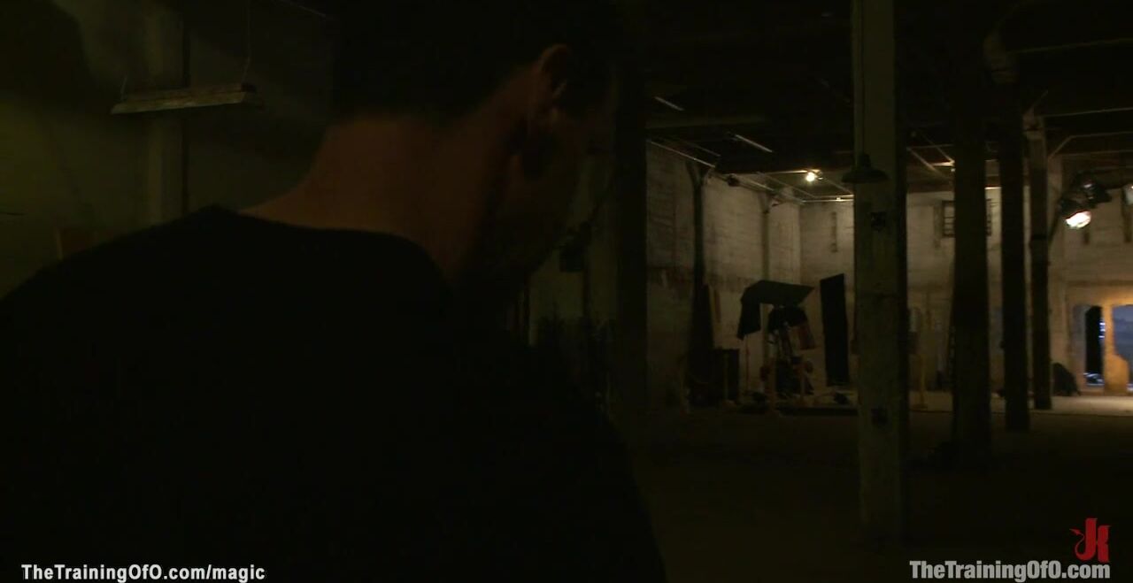 Sexy brunette slave trainee Casey Calvert naked in high heels moving heavy rocks in abandoned building then with made up lisp sucking big black cock to strapped gimp Michael Ambrose
