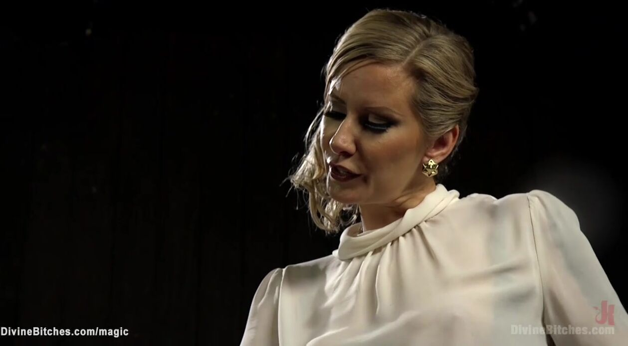 Hot blonde mistress Maitresse Madeline Marlowe spanks then wanks cock to slaveboy DJ then pegs him and gimp with strap on cock in threesome