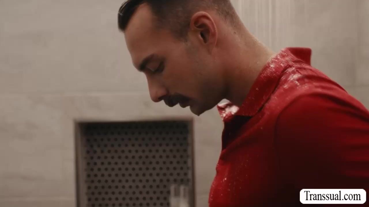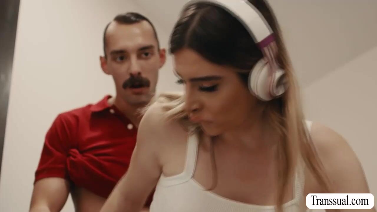 Busty TS Ivory Mayhem is doing her laundry while listening to her music.After that,her stepdad enters the laundry room and he then bareback her ass so hard.Next is,they move into the bathroom and throats stepdads big cock before she rides it again.