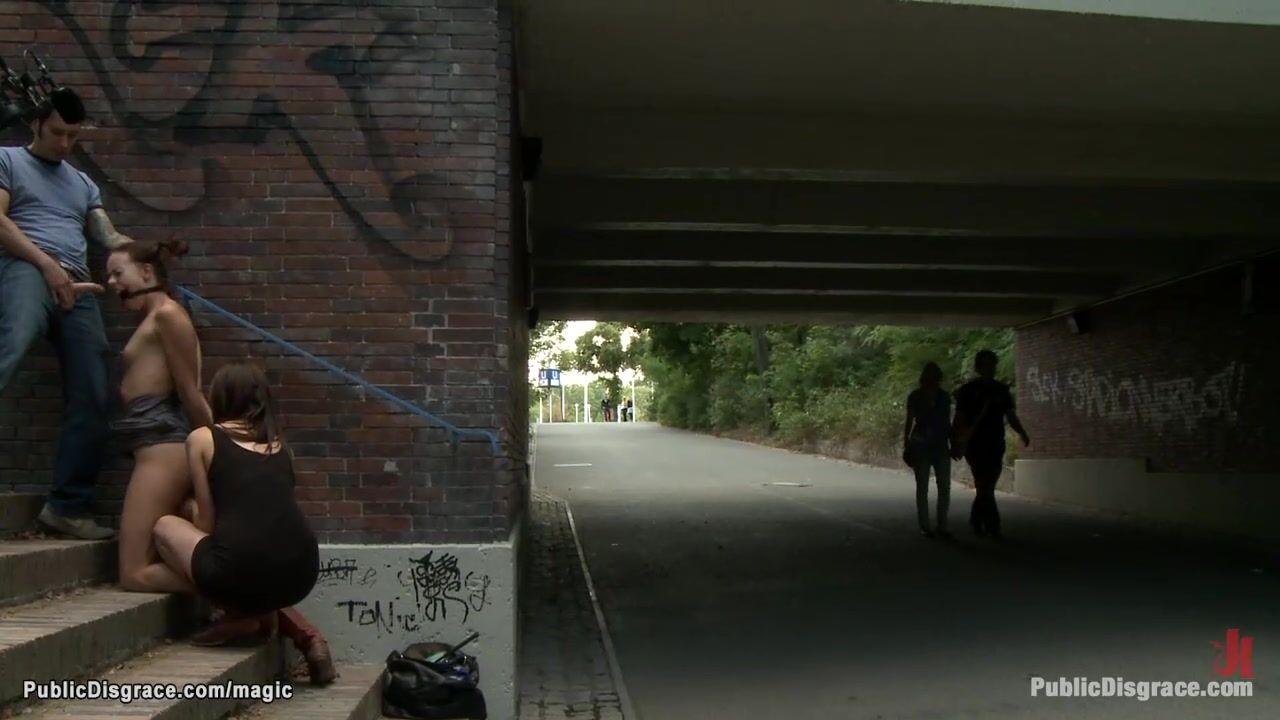 Hot German brunette slave Black Lady with remote controlled toy in pussy walking in public streets then bound fucking big cock of Tommy Pistol