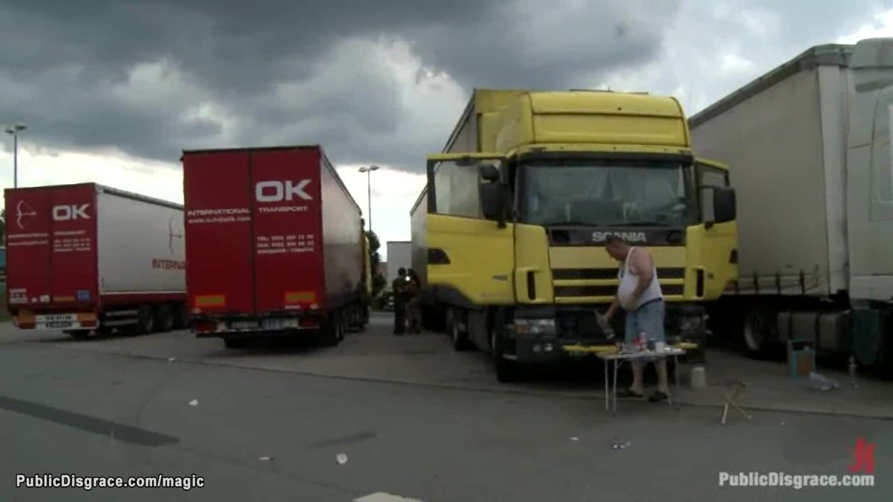 Gagged brunette Euro babe Felicia D with bound hands behind back gets big dick fucked at truck parking then humiliated in public in front of fast food