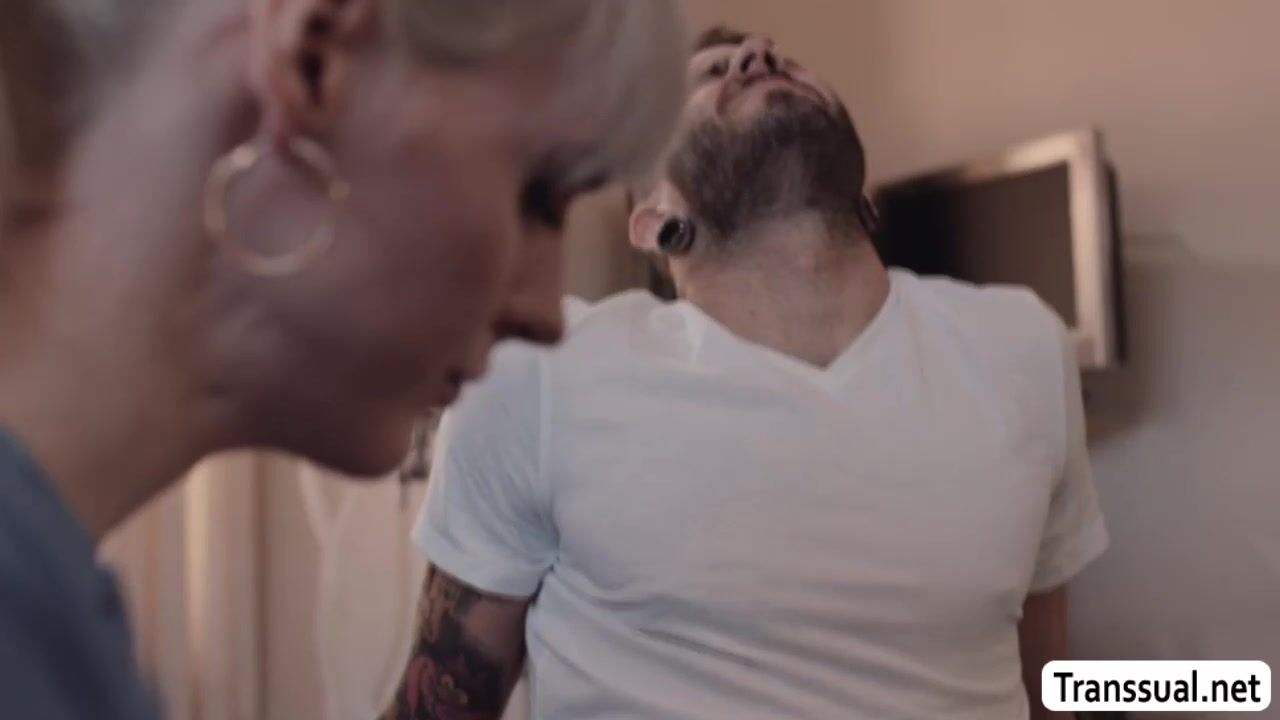 Injured dude goes to the massage parlor and lets the Tgirl masseuse massage his legs.After that,he gets naked and lets her continue the massage.The TS masseuse pulls out her shecock and lets him suck it before she bareback fucks his ass.