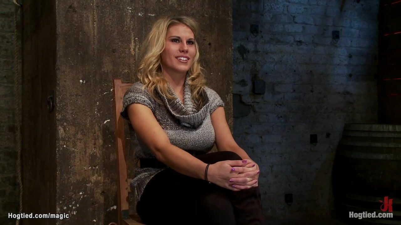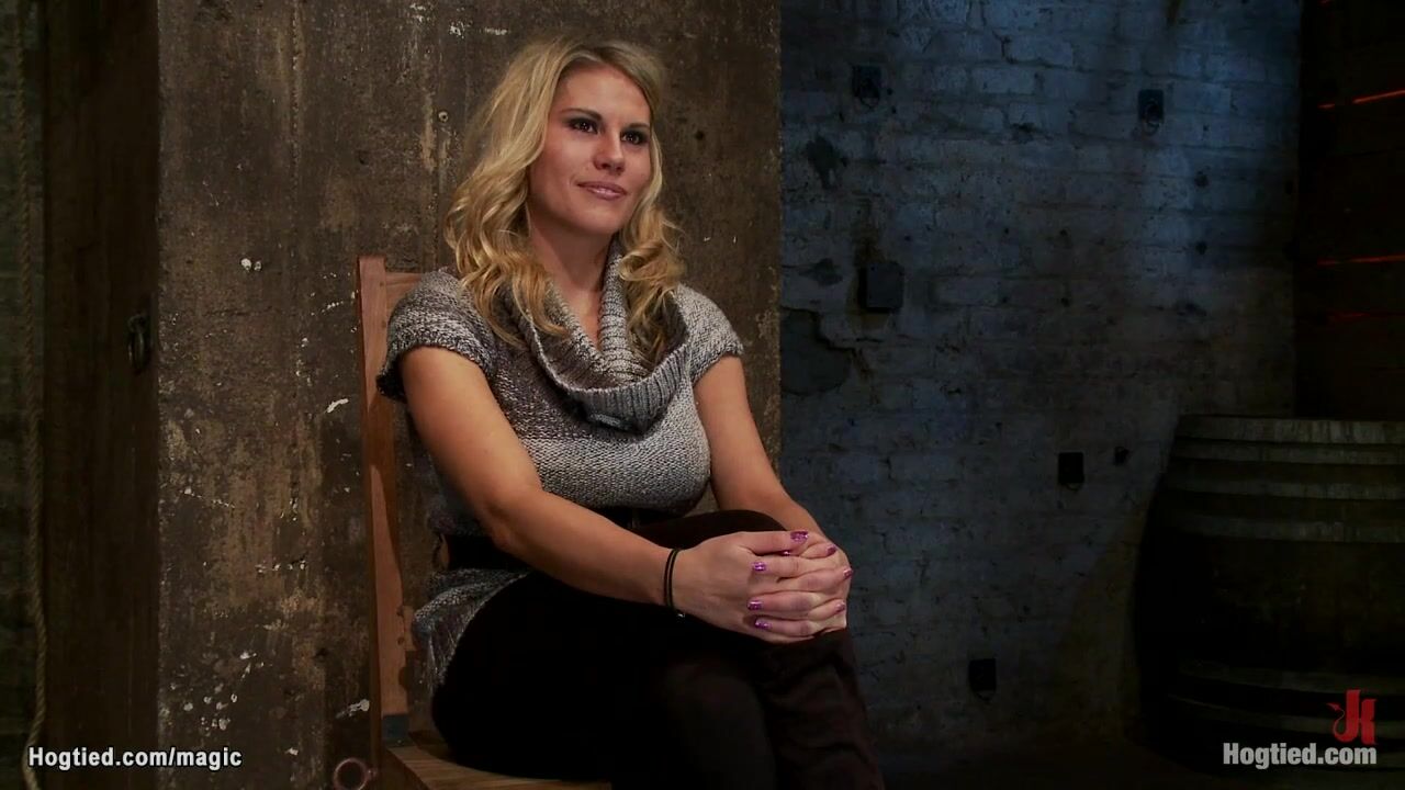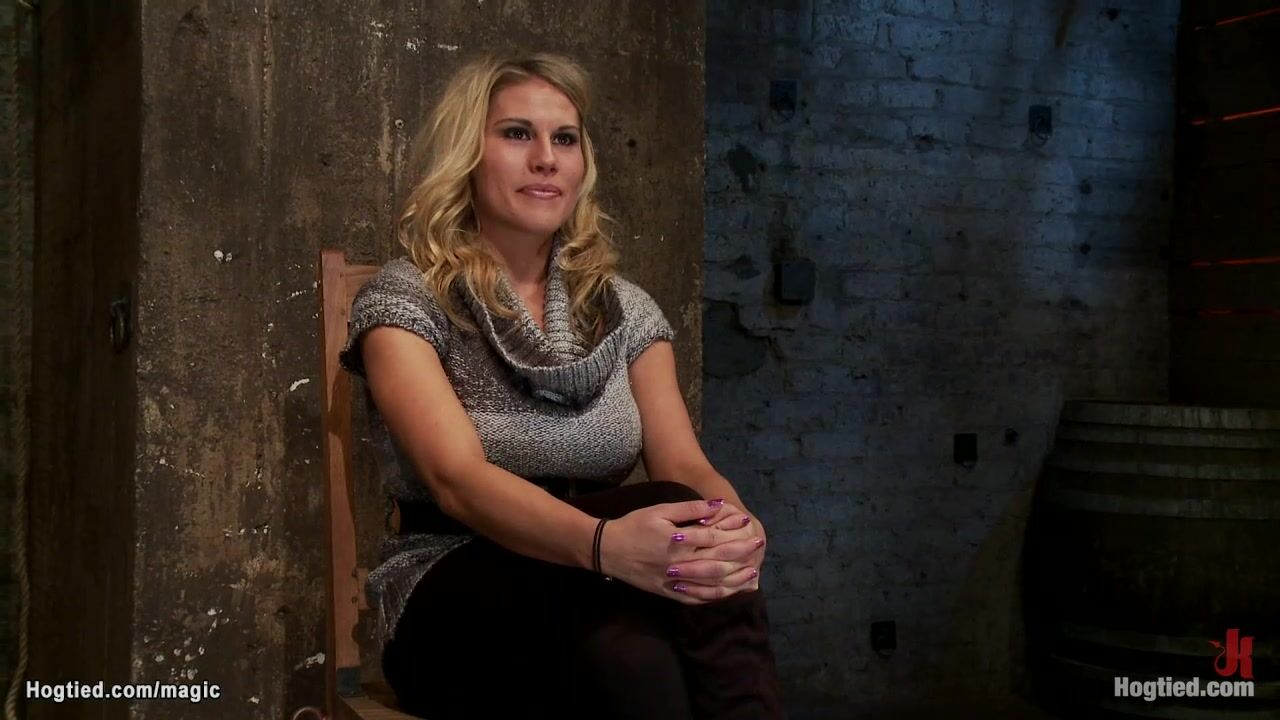 Description: Big boobs gagged blonde slave Charisma Cappelli gets ankles bound to wrists and both bound to spreader bar with nipples clamped and bound to bar too gets pussy fingered and vibrated