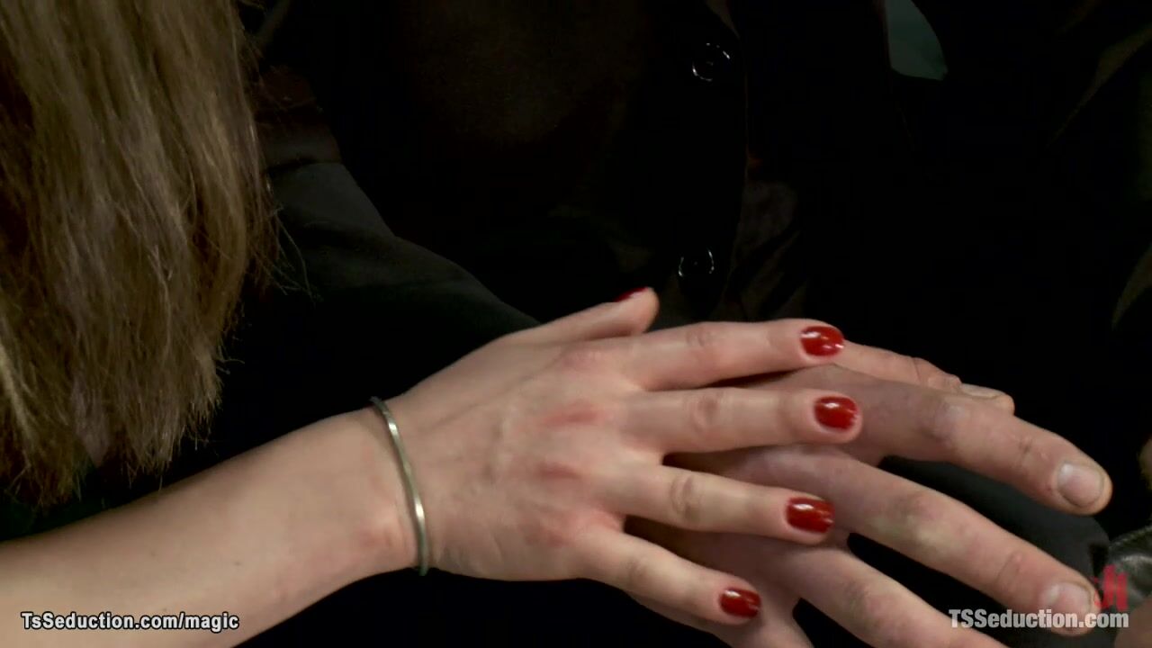 Hot brunette shemale Aly Sinclair binds security guard Chris Archer in local gallery and shoves cock in his ass and wanks him to orgasm