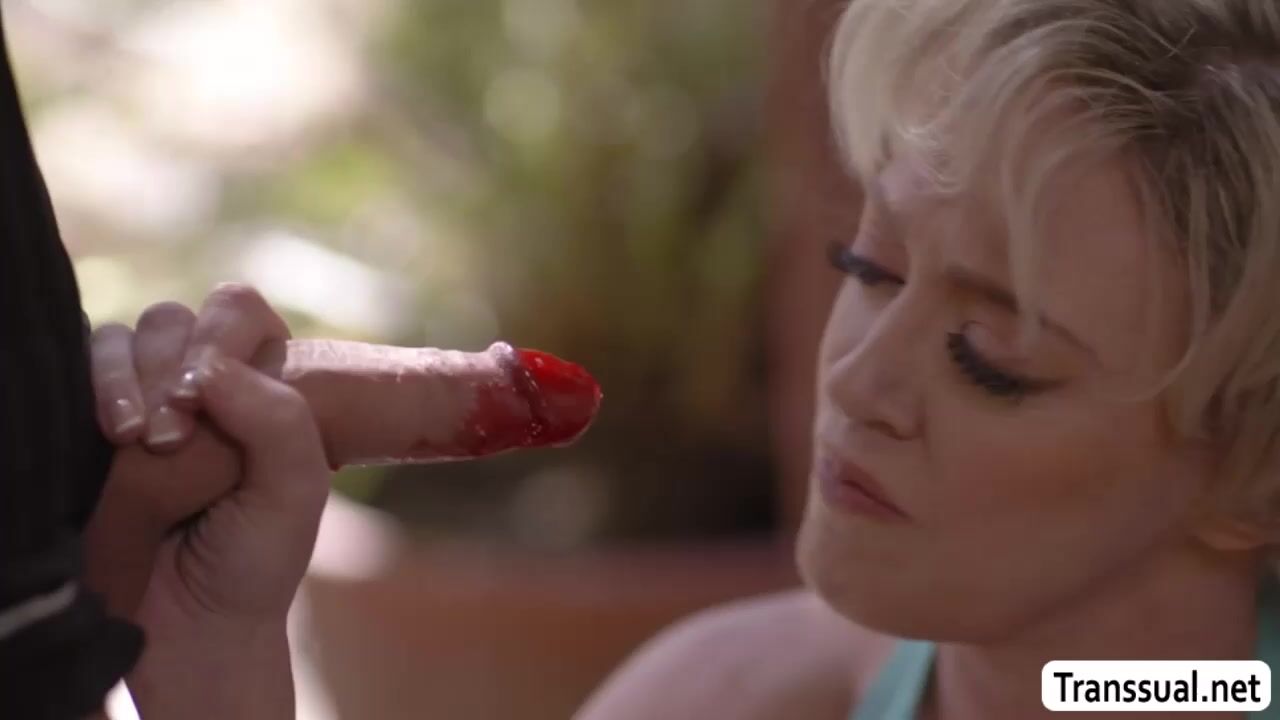 Lustful milf is on the couch masturbating and she saw her shemale neighbor fucking her pie.Instead of getting mad,she throats her TS neighbors shecock passionately and in return,she gets her wet pussy pie fucked by her trans neighbor.