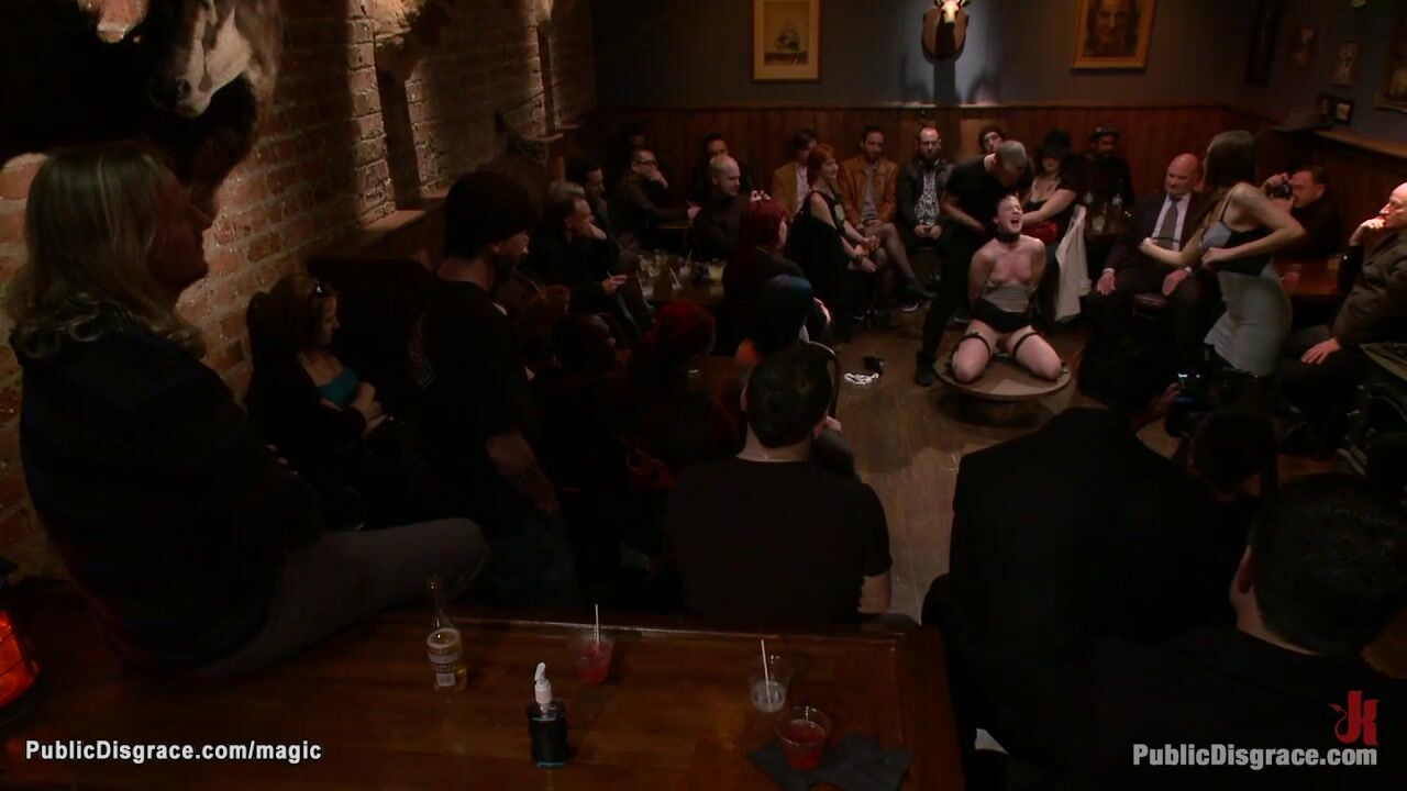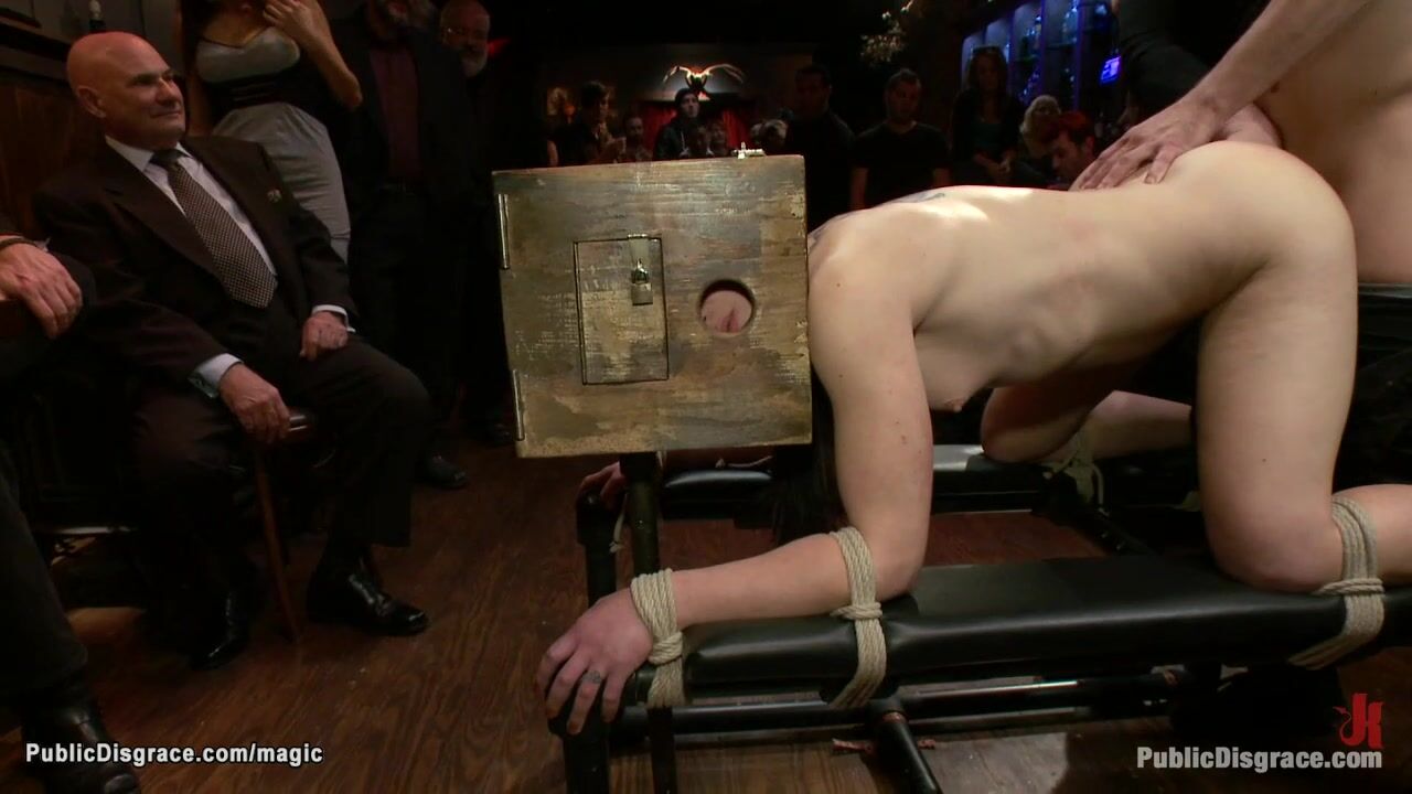 Brunette slave Cheyenne Jewel is bound in doggy position with head in wooden box and gets anal fingered and pussy fucked in crowded public bar