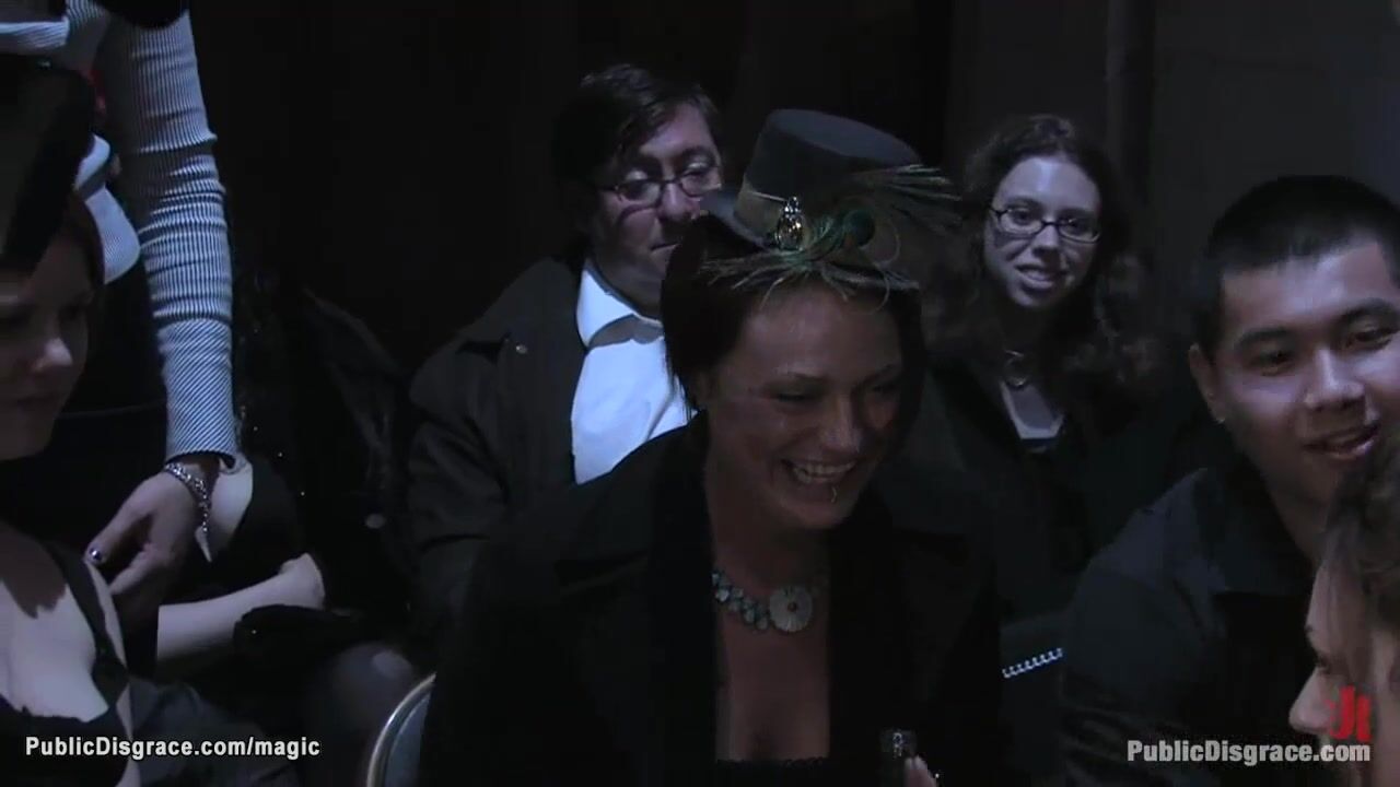 Bound slave Sarah Shevon holding plate with glasses while group od strangers groping her then strapped legs and spreaded caned in public place