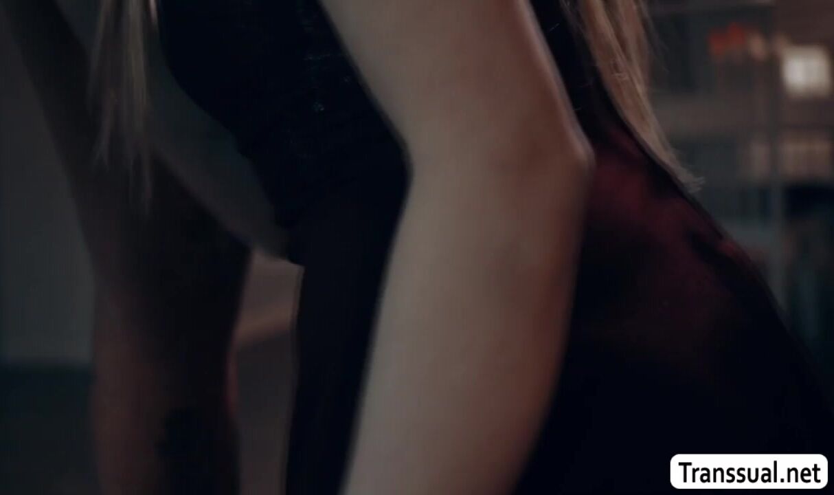 Slutty shemale caught by her stepbrother sneaking into their house late at night.She throats his hard big cock passionately so he wont tell their parents.After that,she lets him bareback her tight wet ass so deep and hard.