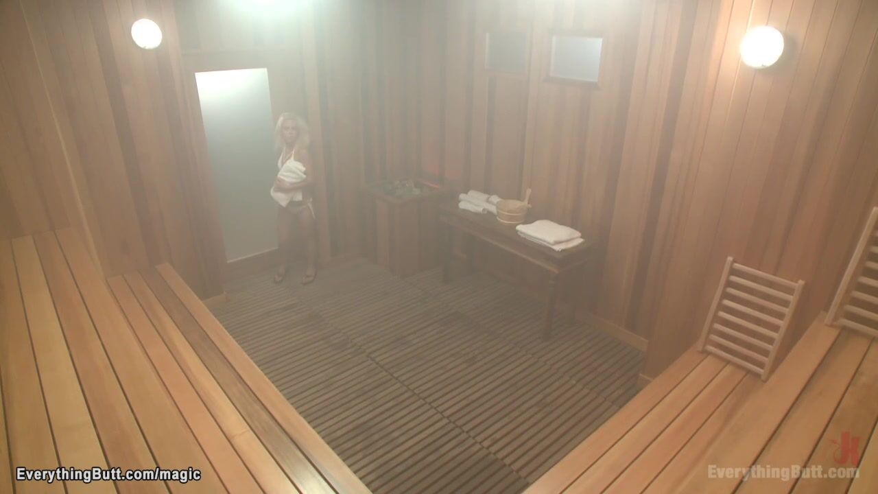 Three super hot lesbians Holly Hanna and Krissy Lynn and Nickey Huntsman in anal adventure toying and fucking in various positions in the sauna