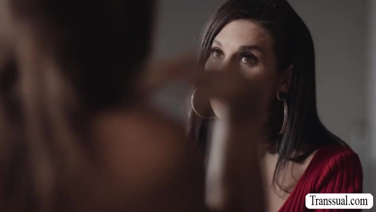Goth tattooed stepmom shows her tits to her shemale stepdaughter.After that,they start kissing and suck their nipples passionately.Next is,she throats the tranny cock of her TS stepdaughter and in return,she gets her pussy fucked so deep and hard.