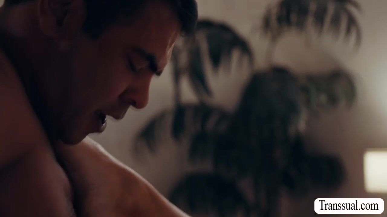 Fat dude gets home and saw his shemale stepsister taking a nap on the couch.He pulls out his dick and jerks it off in front of his TS stepsister.After that,his TS stepsister awake and she then throats his dick and lets him bareback her ass.