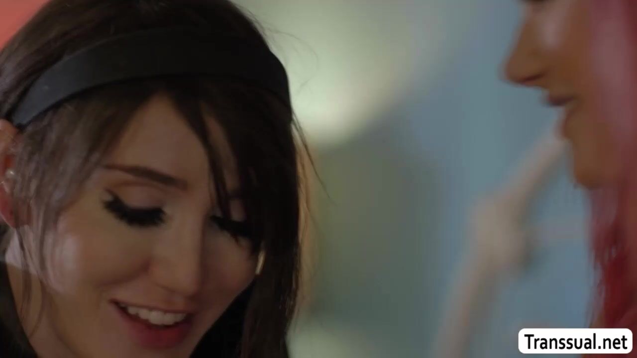 Trans brunette and her pink haired stepsister are on the bed talking.After that,they get horny and start kissing and sucking their nipples passionately.Next is,she lets her stepsis throat her tranny cock before she fucks her tight wet pussy so hard.