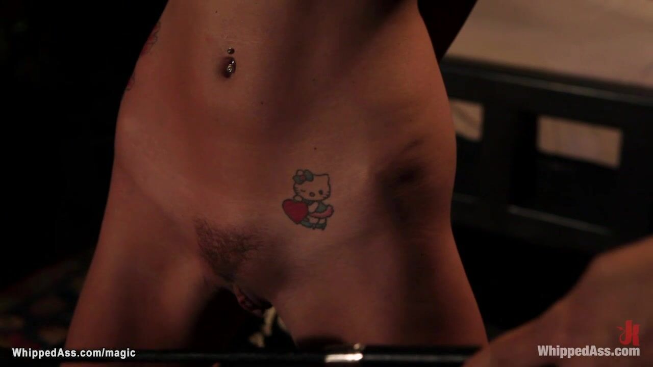 Ginger lesbian slave Monique Alexander is blindfolded and bound on knees then big tits and pussy whipped by lezdom brunette Bobbi Starr in bedroom