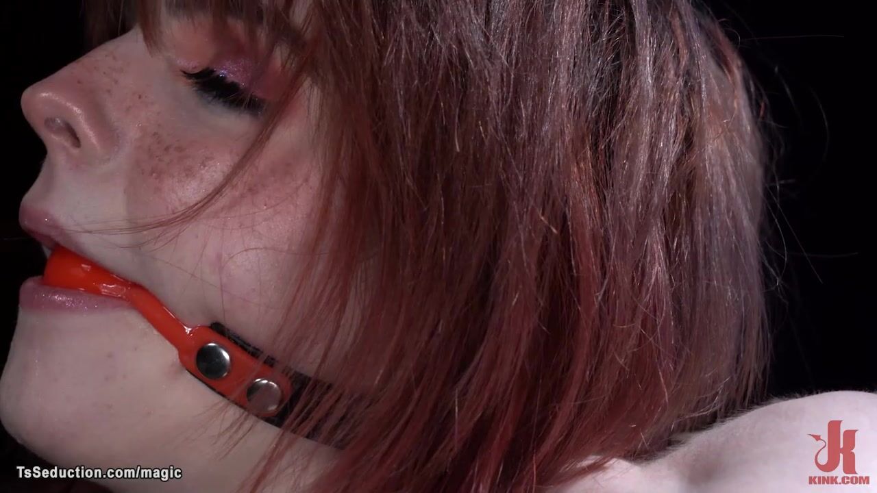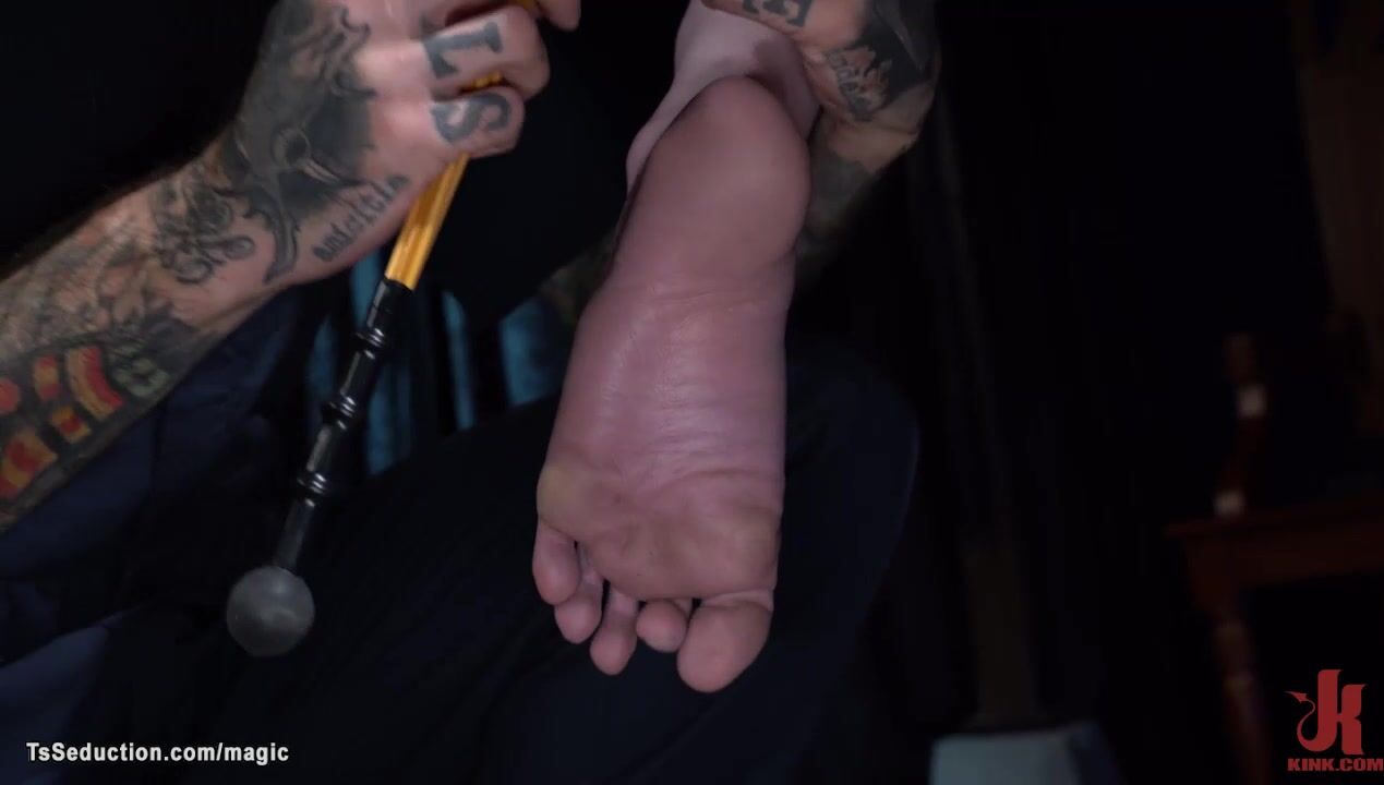 Master Ruckus suspends gagged redhead shemale slave Ella Hollywood and canes her bare feet and fingers her ass and wanks her cock on sybian