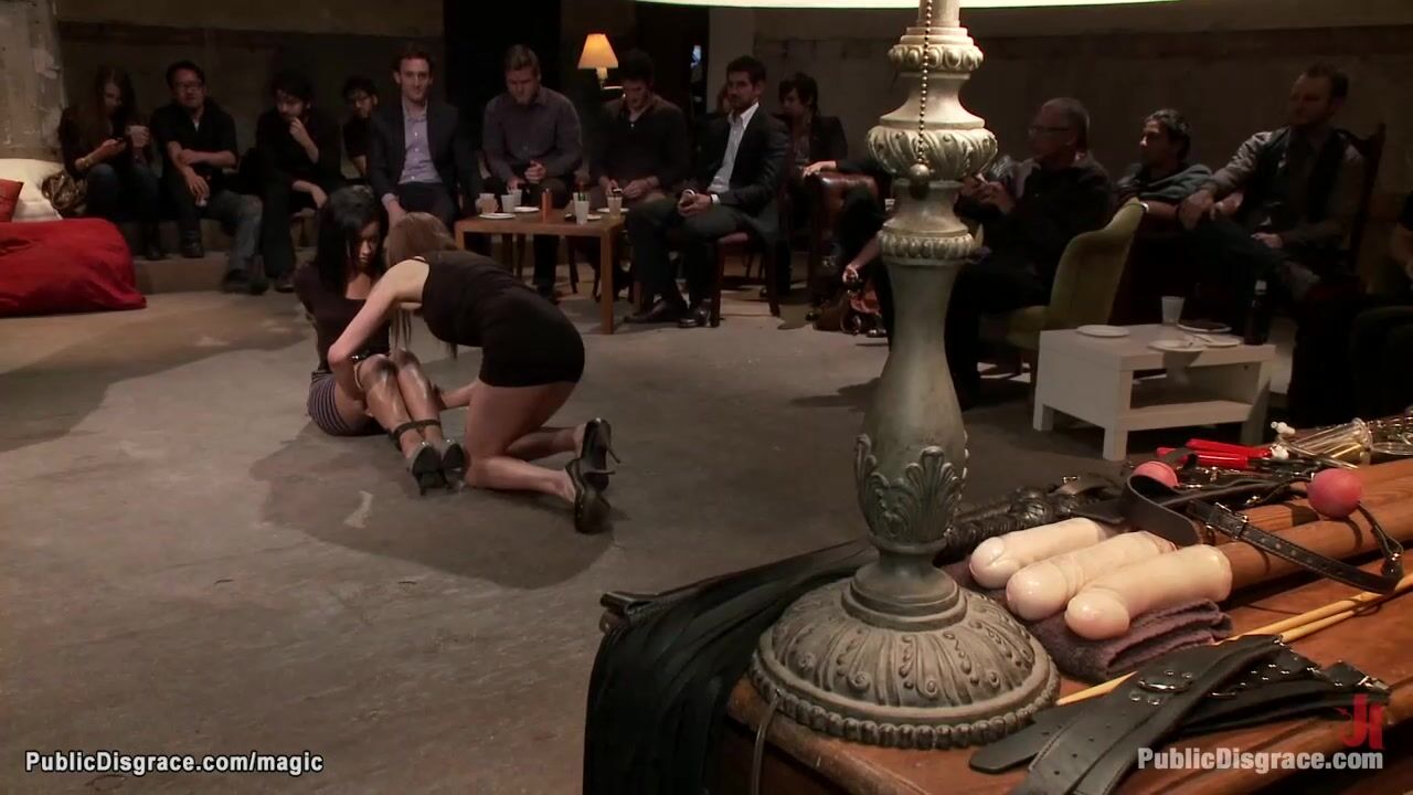 Tattooed little tanned slave beauty Skin Diamond gets strapped by dom Princess Donna Dolore then group mouth fucked by James Deen and strangers in public
