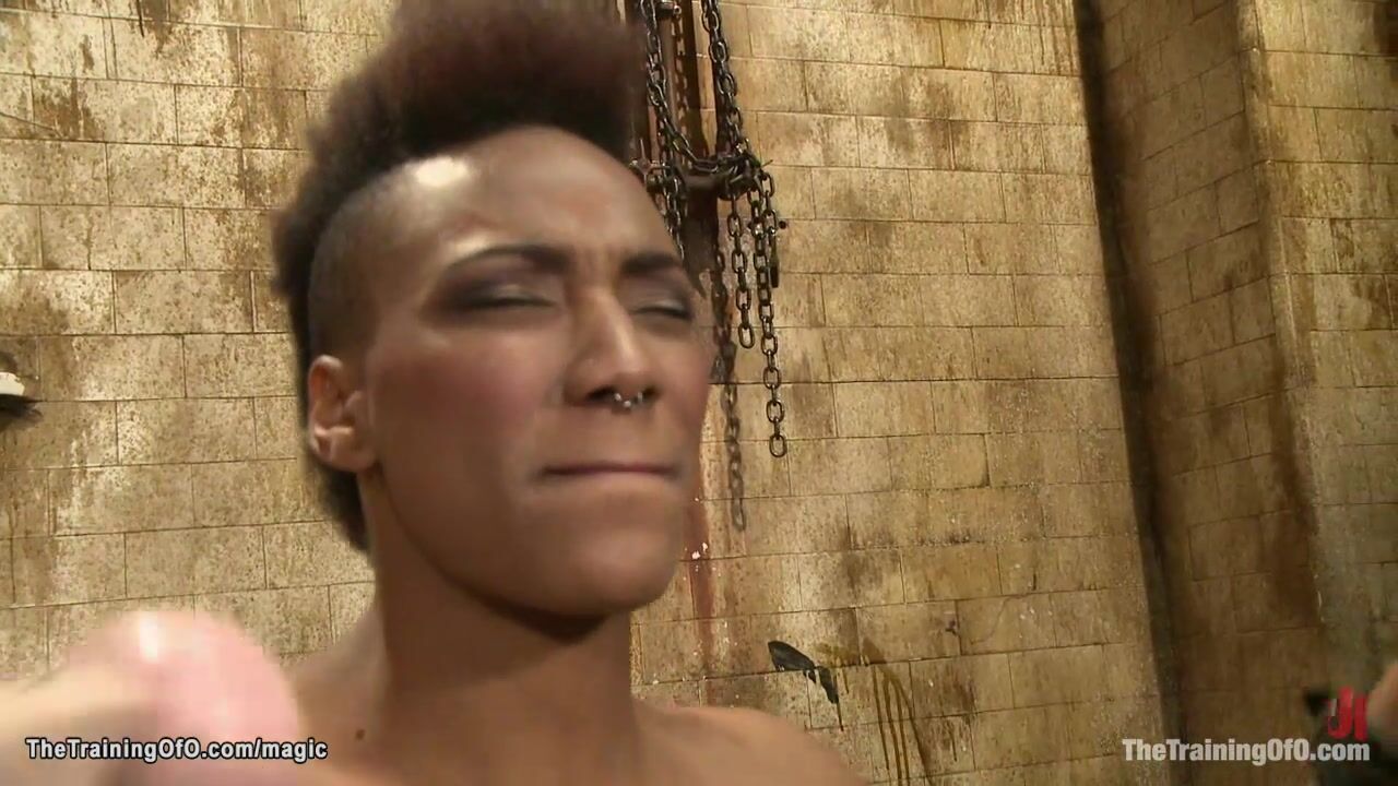 Ebony trainee Nikki Darling in pink panties in squating position wanking dildos then chaied getting hard whipped and made fucking dildo by master James Mogul