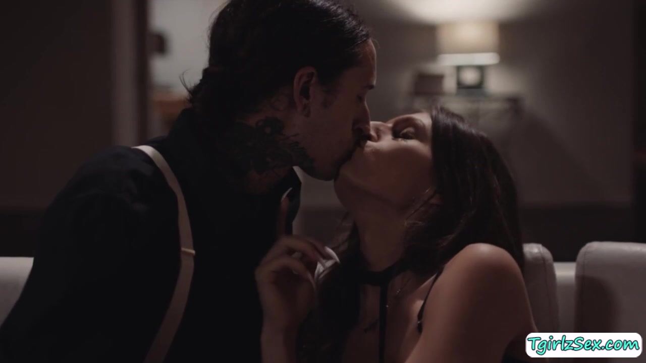 Tall and brunette tranny babe Jade Venus joins tatooed starighy guy Ruckus in the couch with her hands running towards his big hard cock leaning near to kiss. Slowly, the big tits shemale bows down to deepthroat blowjob his dick and stretch ass for anal bareback.