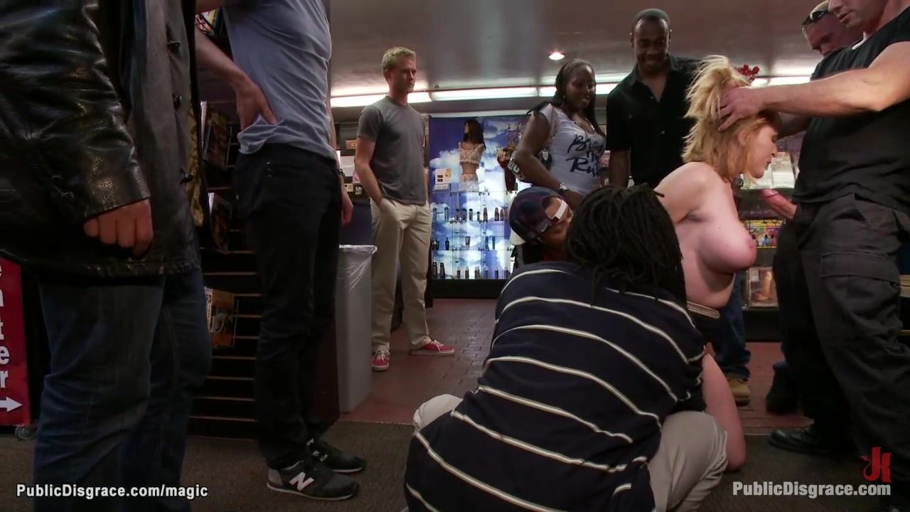 Big boobs blonde MILF Krissy Lynn is bound in public place and deep throat fucked while strangers groping her boobs then anal fucked by John Strong