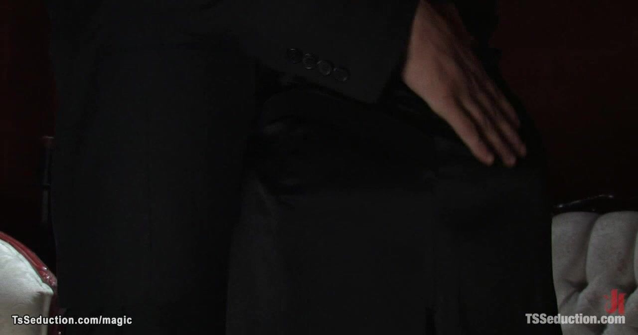 Big boobs tattooed Latina shemale Foxxy seduces guy Martin Lorenzo at Masquerade party and rough anal fucks him with big cock bound in bed