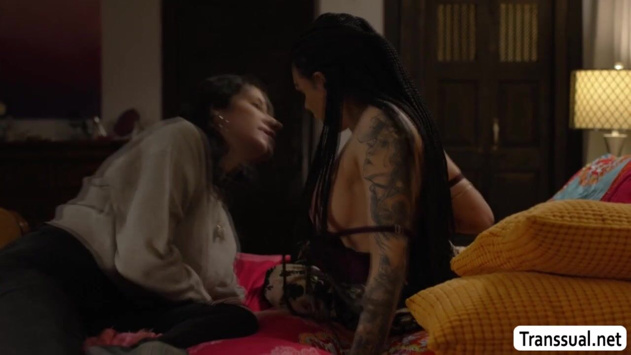 Horny tattooed babe goes to the room of her TS stepsister and they start kissing each other on the bed.After that,she throats her TS stepsister big tranny cock and in return,she gets her pussy licked and fucked by her latina TS stepsister.