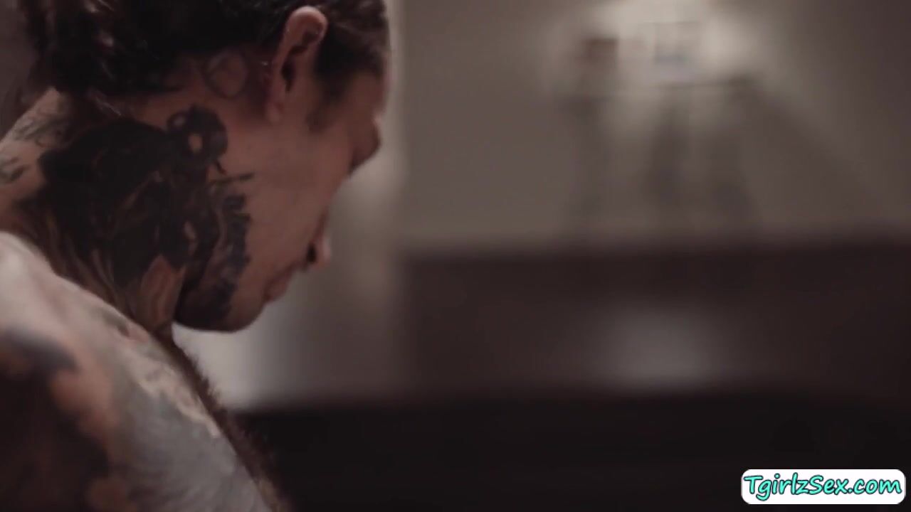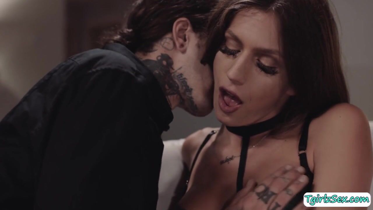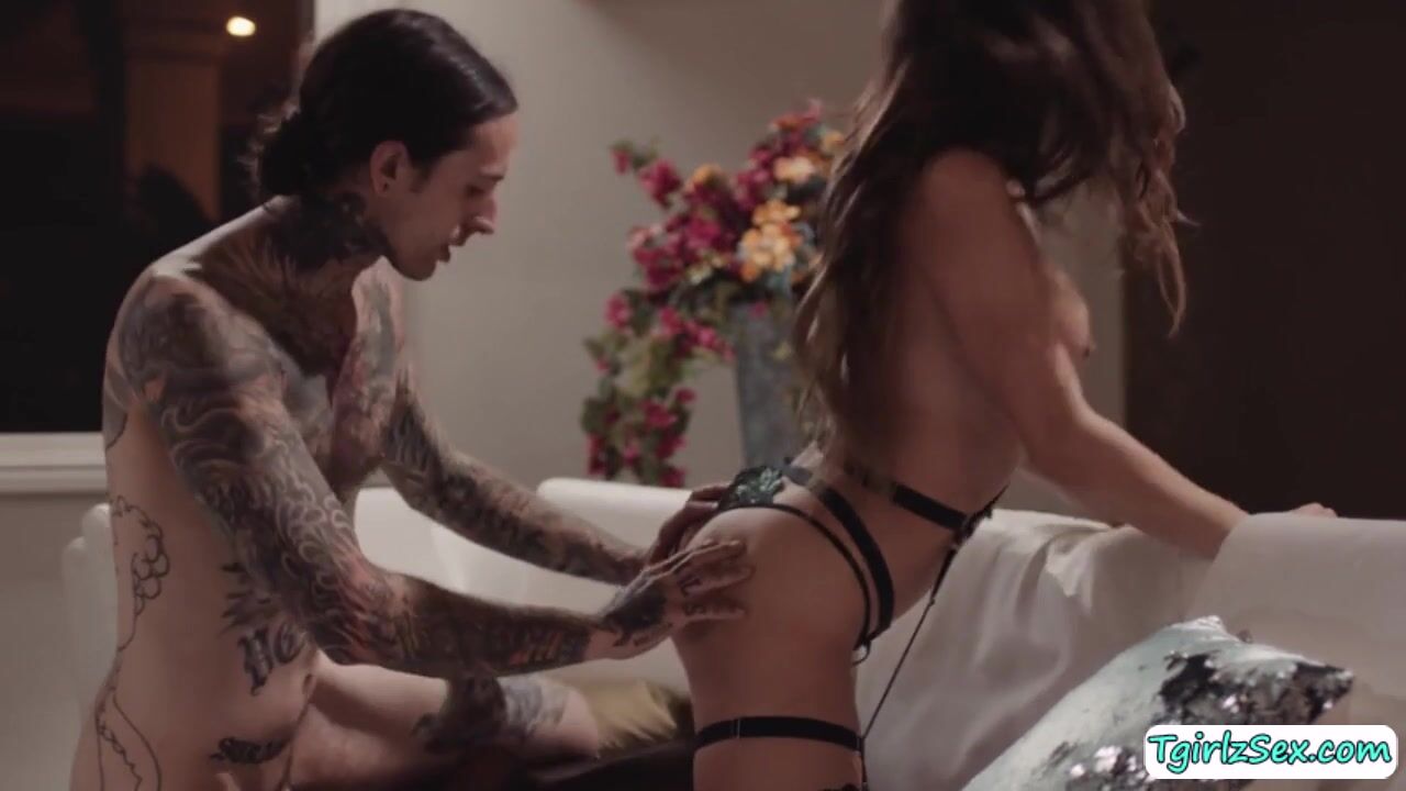 Hunk tattoed guy Ruckes Jade welcomes big tits brunette transexual Jade Venus with open arms in the couch. Their hands reaches for both their big cocks rubbing while kissing tenderly before they take turn to deepthroat blowjob before he anal barebacks.