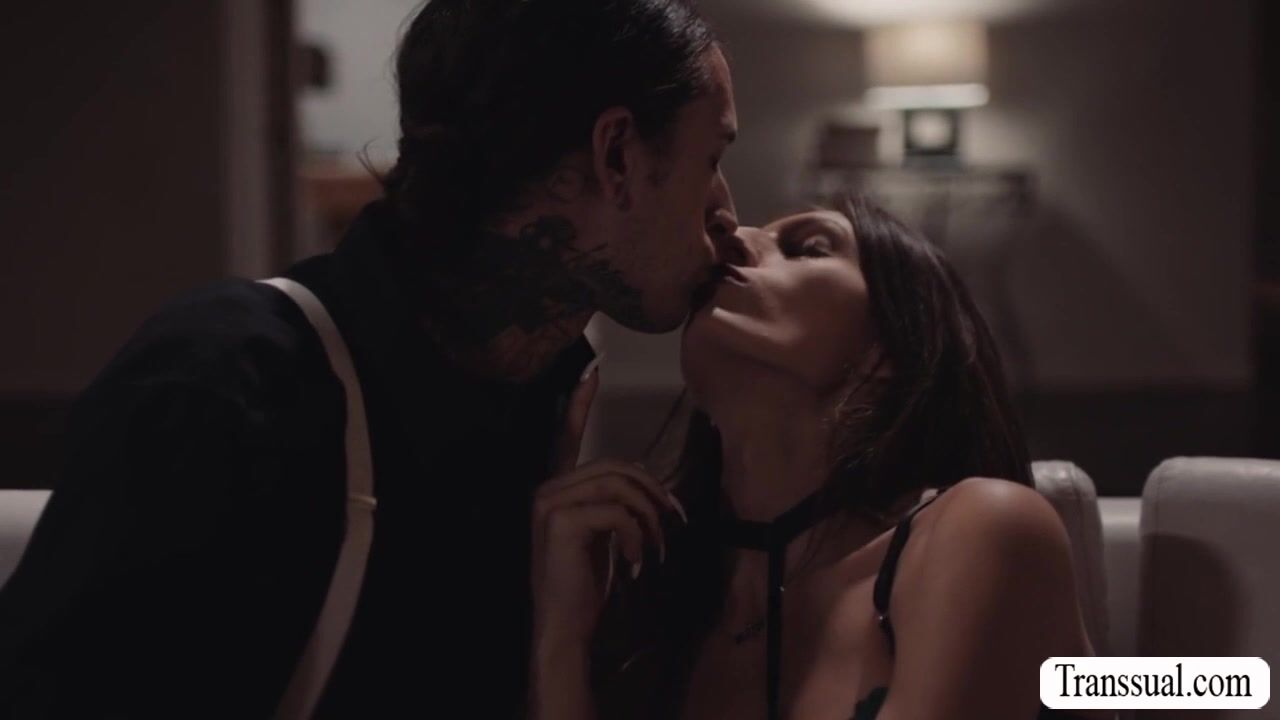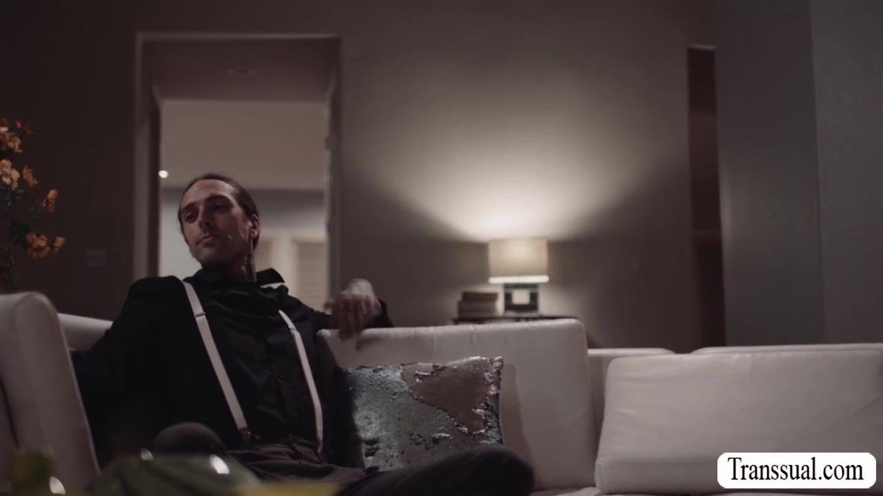 Tattooed dude is on the couch taking selfies while his TS mistress is in the back watching.After that,they start kissing each other passionately and then she throats his dick.In return,the guy licks her ass first and fucks it so hard.