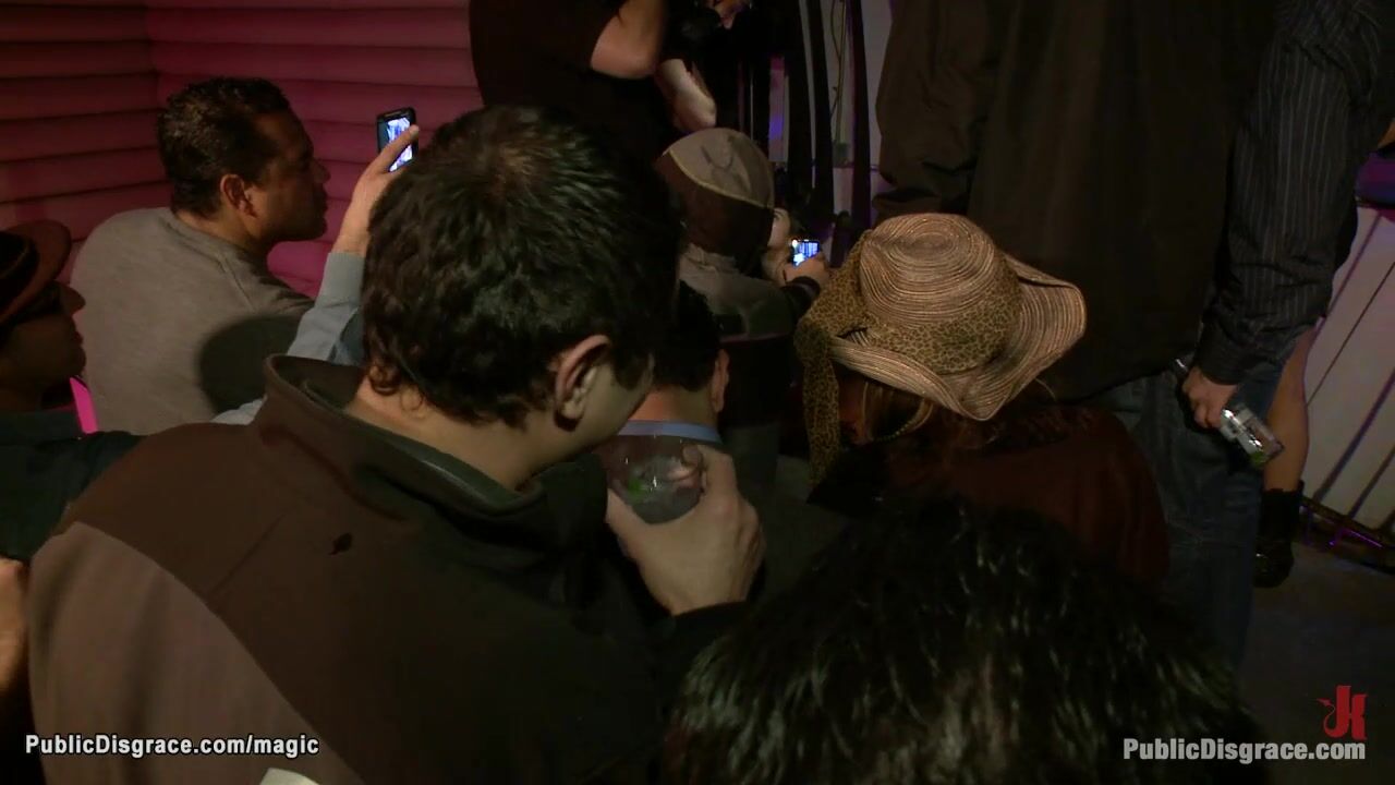 Sexy brunette babe Lou Charmelle is bound in crowded public bar and fucked in the ass by huge cock James Deen and vibed by Princess Donna Dolore in front of horny strangers
